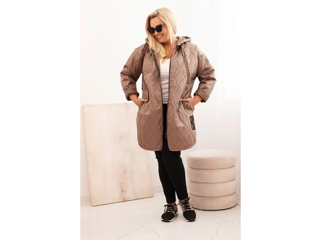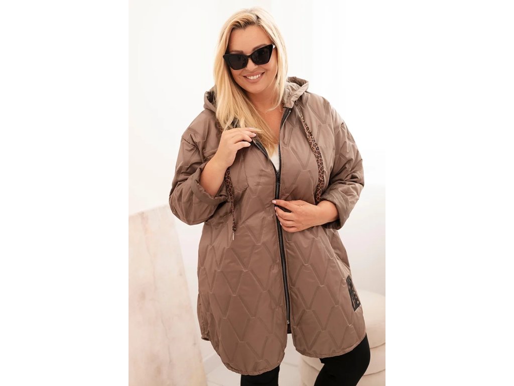Stylová dámská prošívaná bunda ve velikosti plus size je vynikající volbou pro ženy nosící větší velikosti – od XL do 4XL. Její volný, oversized střih zajišťuje maximální komfort nošení a skvěle se přizpůsobuje postavě, neomezuje pohyb. Model se vyznačuje geometrickým prošíváním, které opticky zeštíhluje siluetu, a módní kapucí se stahovací šňůrkou v leopardím vzoru. Zip a praktická kapsa na prsou podtrhují moderní a funkční charakter bundy.