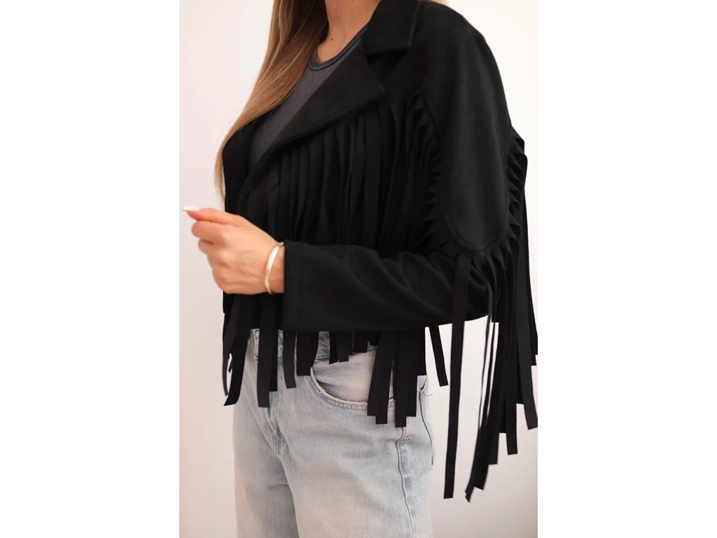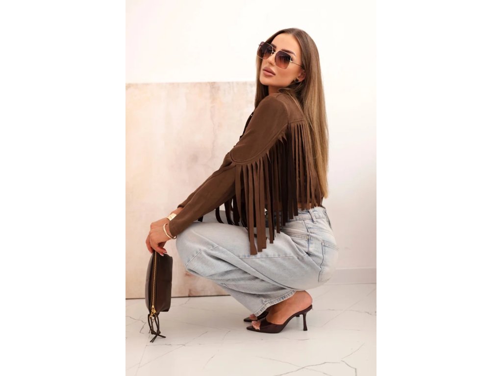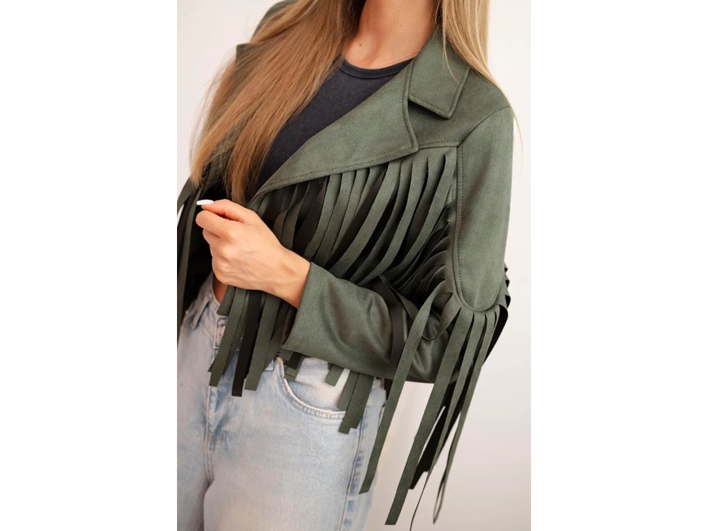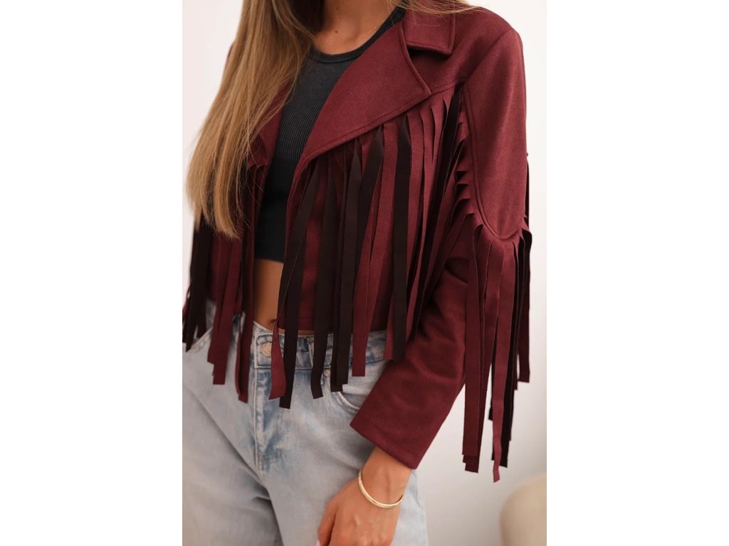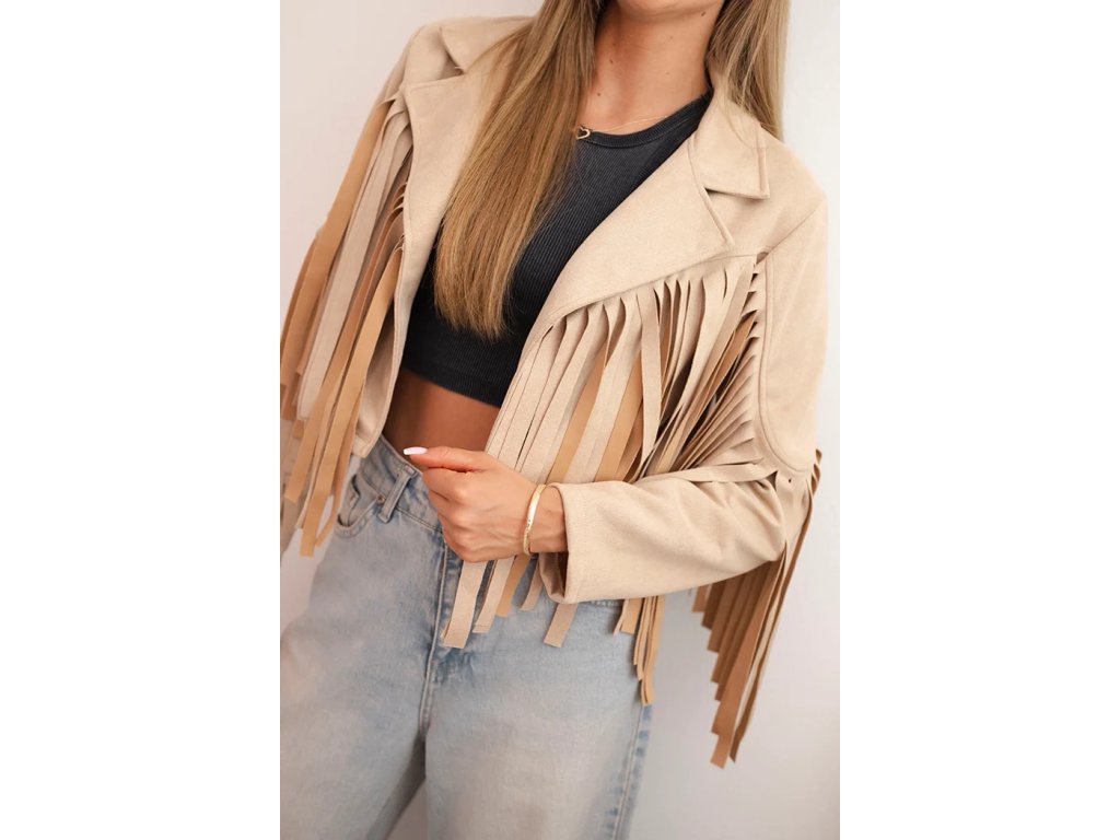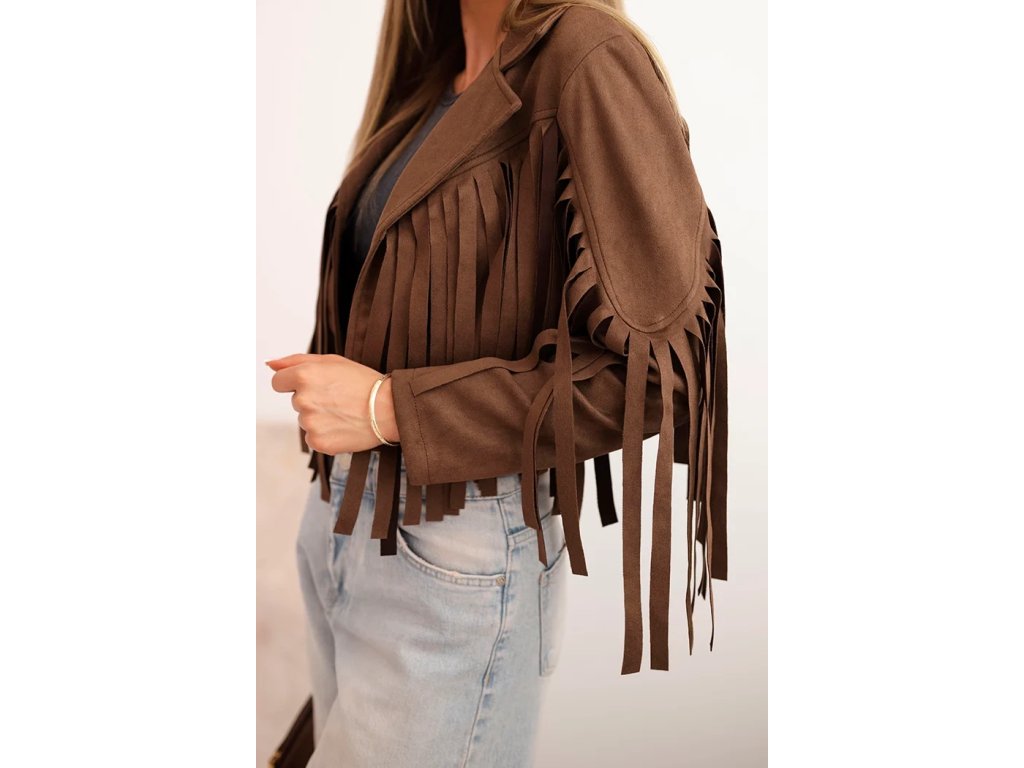 Dámská bunda s třásněmi je výjimečný model, který přitahuje pohledy a dodává outfitu charakter. Vyrobena z měkkého materiálu připomínajícího semiš, dokonale zapadá do nejnovějších boho a western trendů. Krátký střih krásně zdůrazňuje postavu a efektní třásně podél rukávů a přední části jí dodávají uvolněný a stylový vzhled. Skvěle se hodí jak na každodenní nošení, tak na festivaly či venkovní setkání. Tento model je skvělou volbou pro ženy, které si cení jedinečného stylu a pohodlí. Můžete ji nosit jak k džínům, tak k šatům, a vytvářet originální a módní outfity. Velikost je univerzální a bude vhodná pro dámy velikosti S, M nebo L.