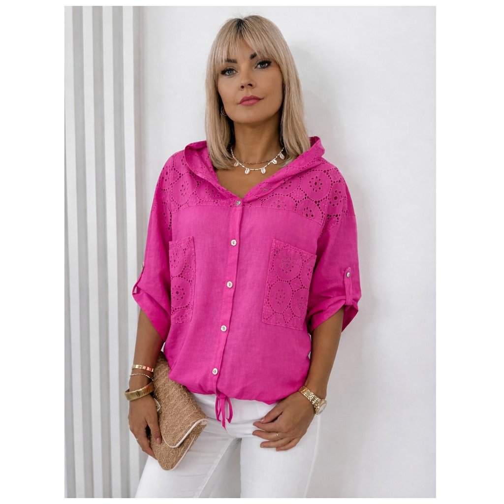 Stylová dámská košile s kapucí, vyrobená z lehkého a prodyšného materiálu, který svým vzhledem i strukturou připomíná len. Spodní lem je opatřen praktickou stahovací šňůrkou, která umožňuje upravit tvar podle potřeby. Zapínání na knoflíčky dodává klasický vzhled, zatímco jemné krajkové detaily na ramenou a kapsách na prsou přinášejí romantický a elegantní nádech. Díky univerzální velikosti je ideální pro postavy od S do XL. Rozměry: obvod přes prsa 120 cm, délka 62/69 cm.