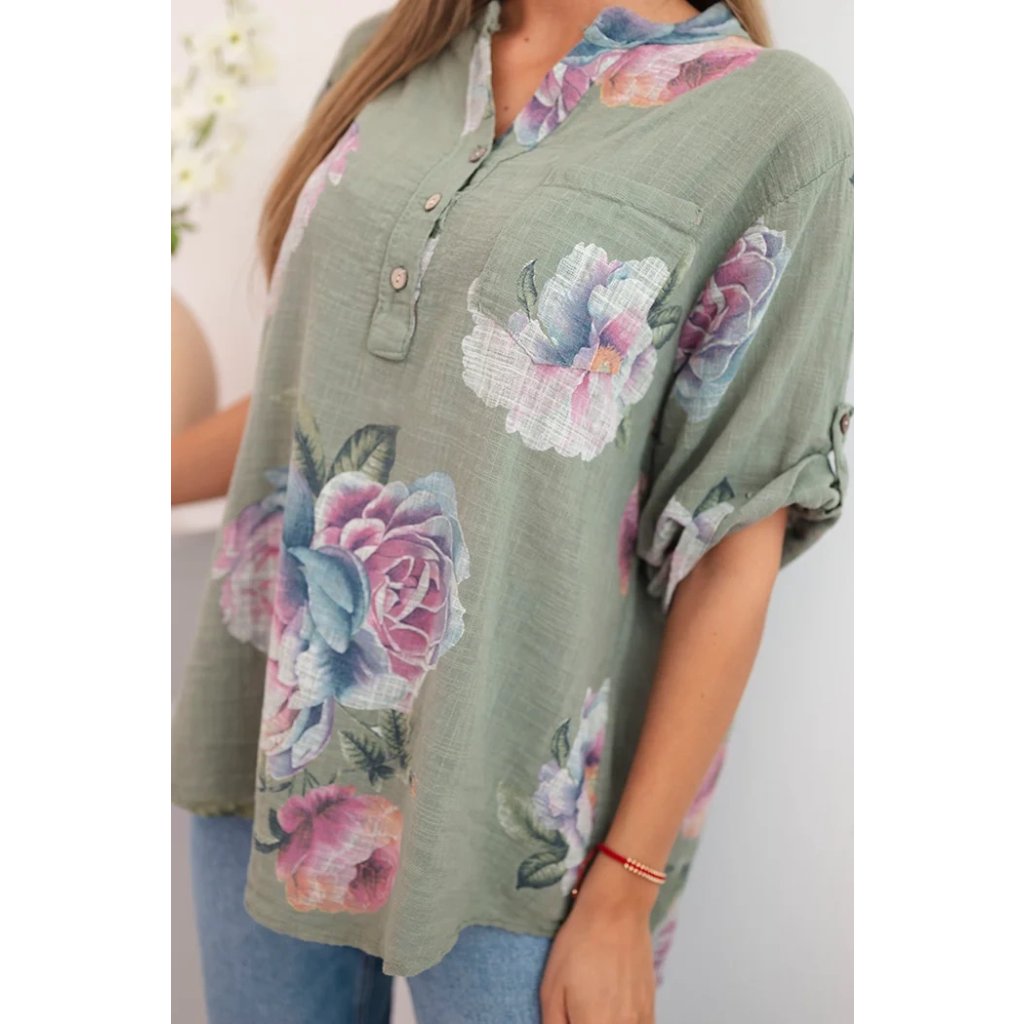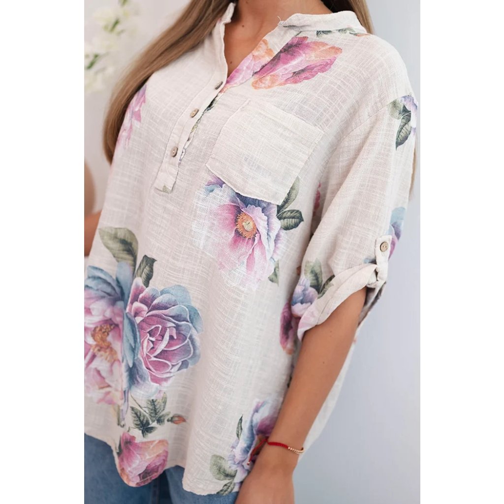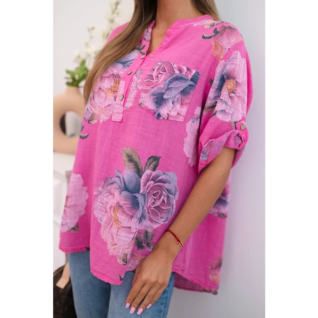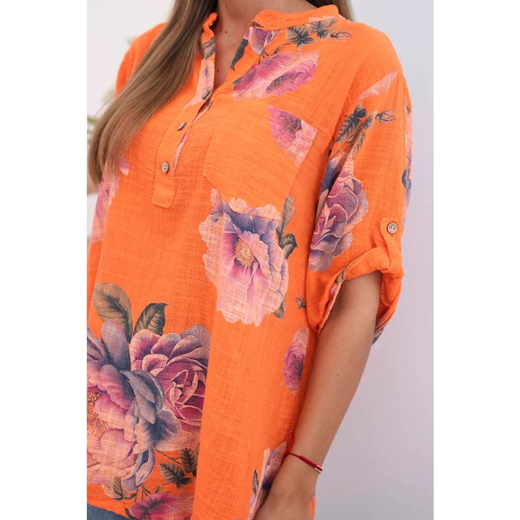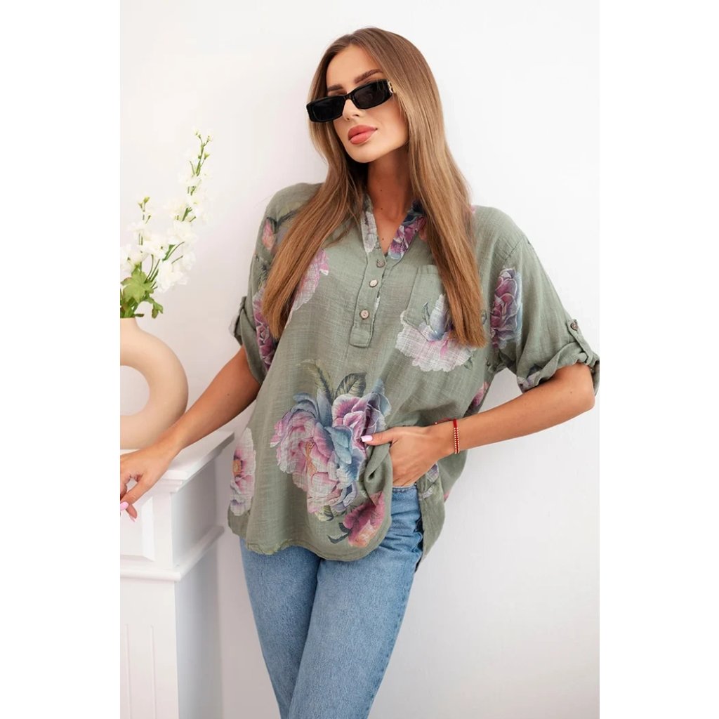 Hledáte lehkou a vzdušnou halenku, která zdůrazní váš ženský styl? Tato dámská bavlněná halenka s květinovým vzorem je ideální volbou pro teplé dny! Její volný střih a jemný materiál zajišťují naprosté pohodlí. Krátký rukáv a mírně prodloužená zadní část jí dodávají moderní vzhled a výstřih do V s knoflíky a praktickou kapsou na hrudi přidávají ležérní šarm. Skvěle se hodí k džínám, šortkám nebo sukním – ideální na každý den, letní procházku nebo setkání s přáteli. Velikost je univerzální a bude vhodná pro ženy velikosti S, M nebo L.
