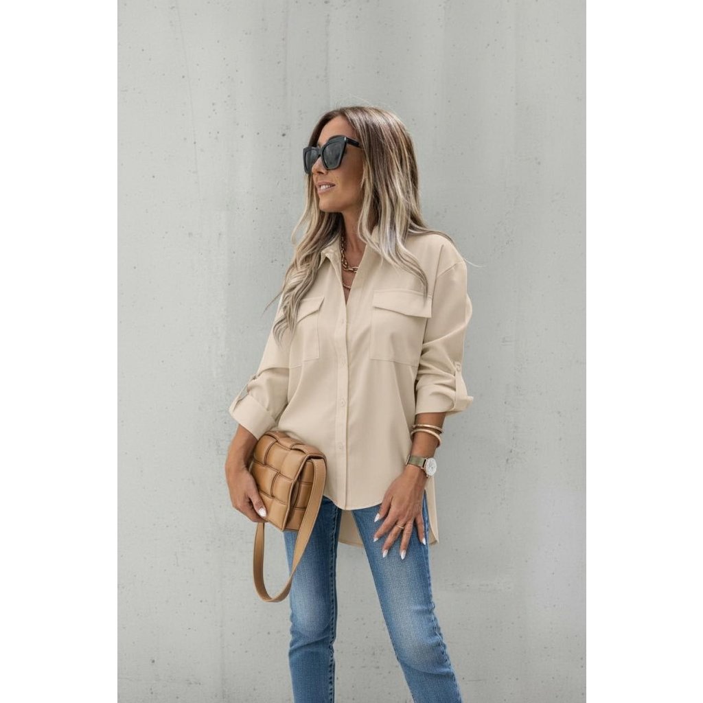 Dámská stylová košile béžová Košile s prodlouženými zády a rukávem na knoflíček
