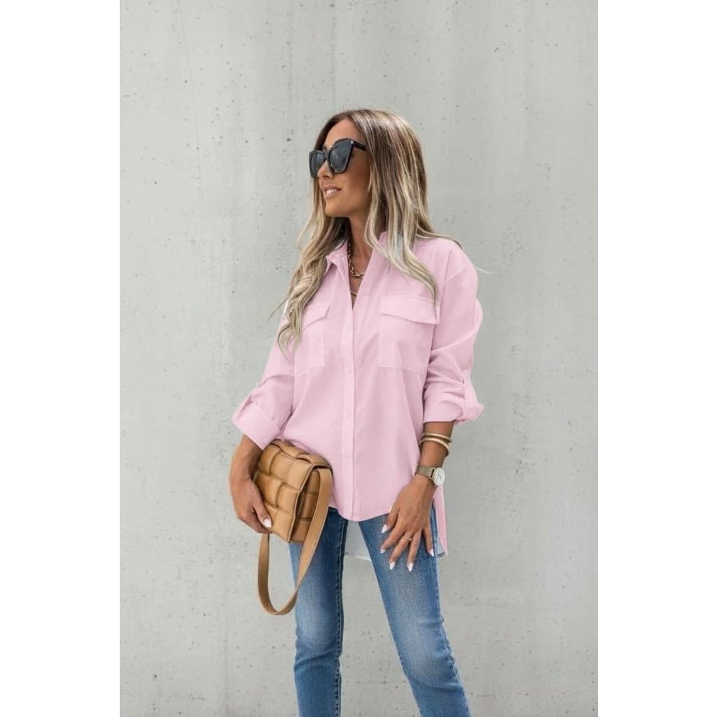 Dámská stylová košile světle růžová Košile s prodlouženými zády a rukávem na knoflíček