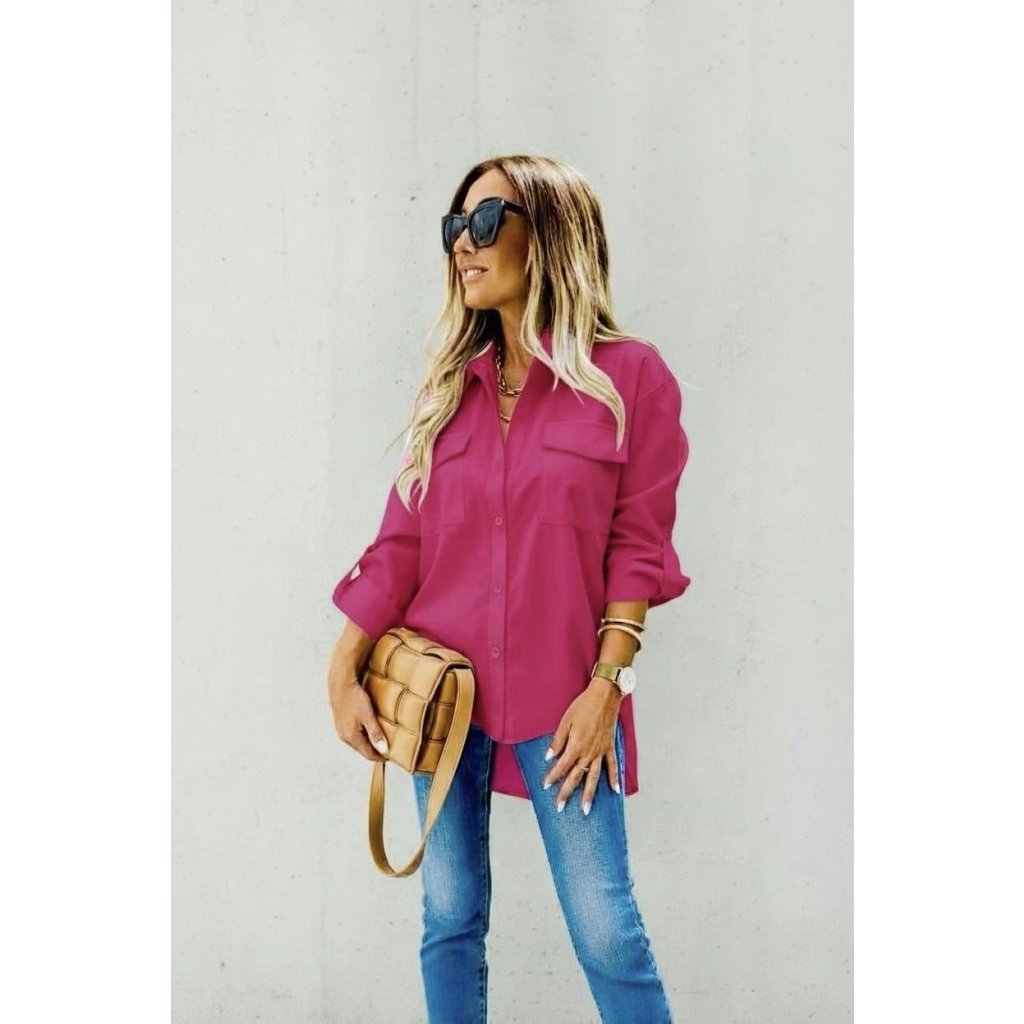Dámská stylová košile tmavě růžová Košile s prodlouženými zády a rukávem na knoflíček