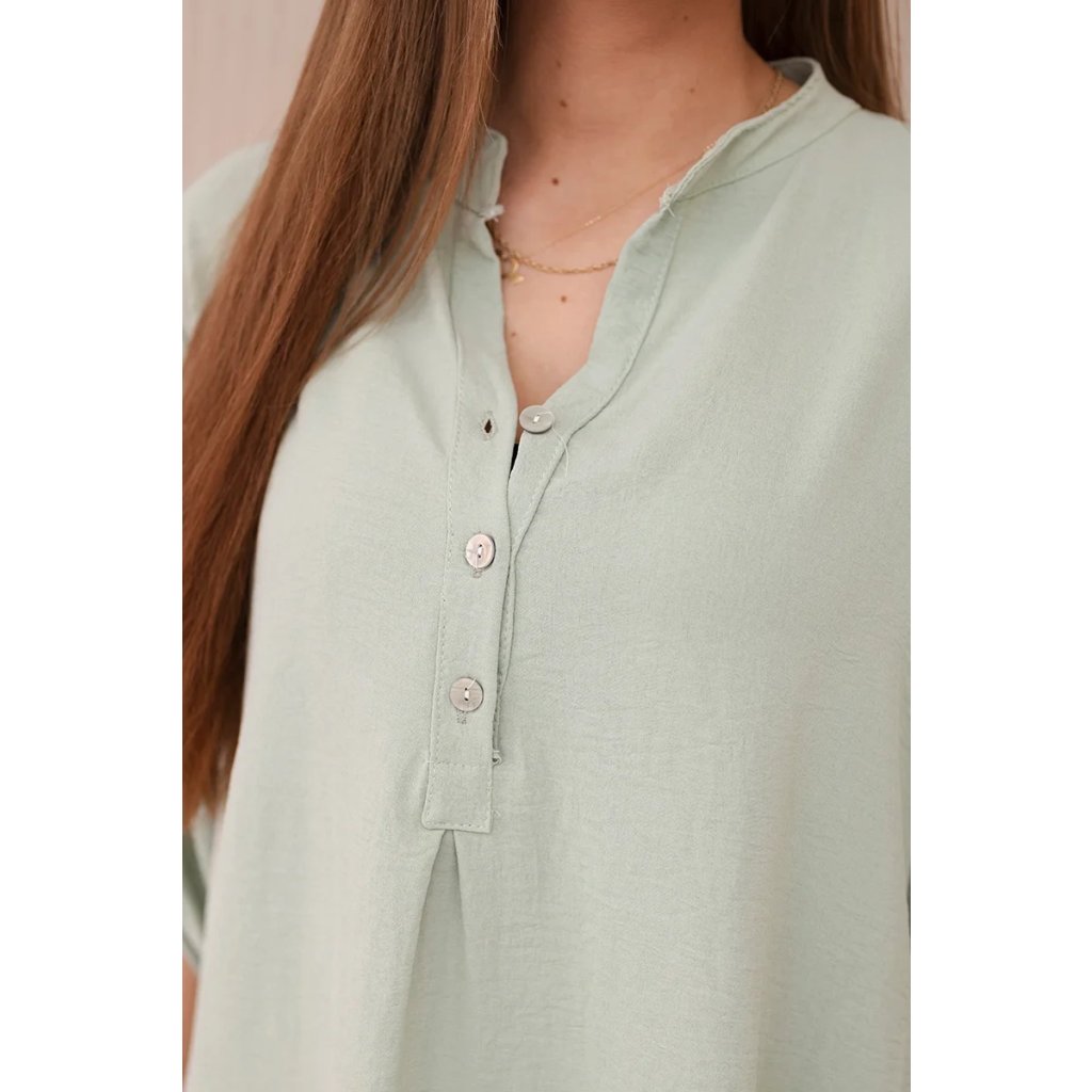 Objevte mimořádnou eleganci a pohodlí v prezentované halence s delšími zády, knoflíkovým výstřihem a ohrnutými rukávy, tato halenka nejen vypadá výjimečně stylově, ale poskytuje také bezkonkurenční funkčnost. Ciťte se sebevědomě a elegantně v halence, která podtrhne váš jedinečný styl. Díky delším zadním dílům vytvoříte jemné a módně nepravidelné proporce a knoflíkový výstřih vám umožní upravit si halenku podle vašich preferencí. Vyhrnuté rukávy dodávají halence lehkost a ležérní charakter, ideální pro různé příležitosti. Ať už se jedná o obchodní jednání nebo relaxační kávu s přáteli, naše halenka vám poskytne pohodlí a styl v jednom. Nenechte si ujít příležitost přidat do svého šatníku tuto jedinečnou halenku! Objevte eleganci, pohodlí a funkčnost v jednom a zdůrazněte svůj jedinečný styl ještě dnes. Velikost je univerzální a bude vhodná pro ženy, které nosí velikost S, M nebo L.