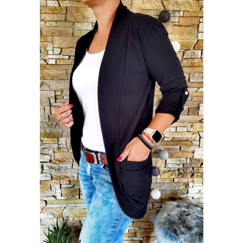 Tenký kardigan teplákového materiálu s dlouhým rukávem. Rukáv lze upravit na 3/4 délku pomocí knoflíčku. Na bocích kapsy. Velikost univerzální, vhodná na velikost XS-L. Rozměry: prsa 104 cm, délka 83 cm.