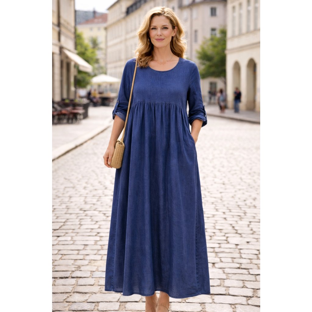 Jeans šaty z lehké džínoviny v univerzální velikosti (sedí na S–XXL) jsou skvělou volbou pro pohodlný každodenní styling. Praktické boční kapsy a regulovatelné rukávy zajišťují funkčnost i variabilitu nošení.