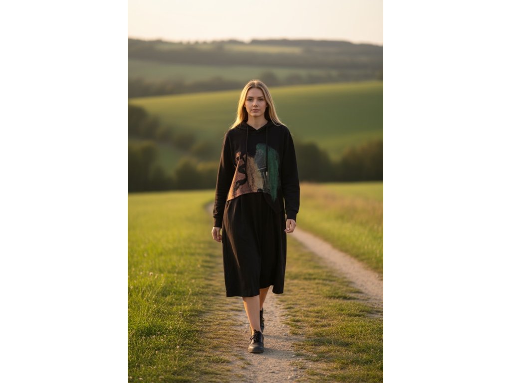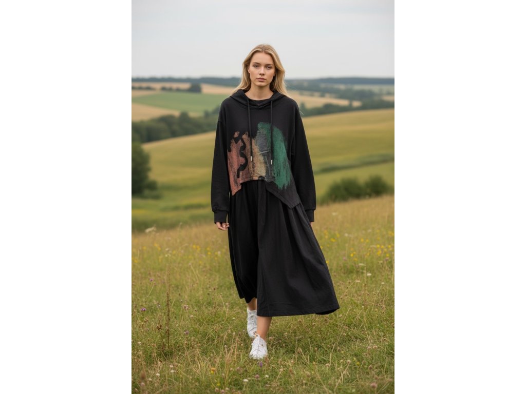 Tyto originální šaty s mikinovým topem spojují městský styl s pohodlím. Horní část je z mikinového materiálu s kapucí na šňůrky a uměleckým potiskem v kombinaci barev, zatímco spodní část tvoří lehce rozšířená sukně z hladkého materiálu. Model působí efektně díky vrstvenému střihu, který zakryje drobné nedostatky postavy a dodá šmrnc každodennímu outfitu.