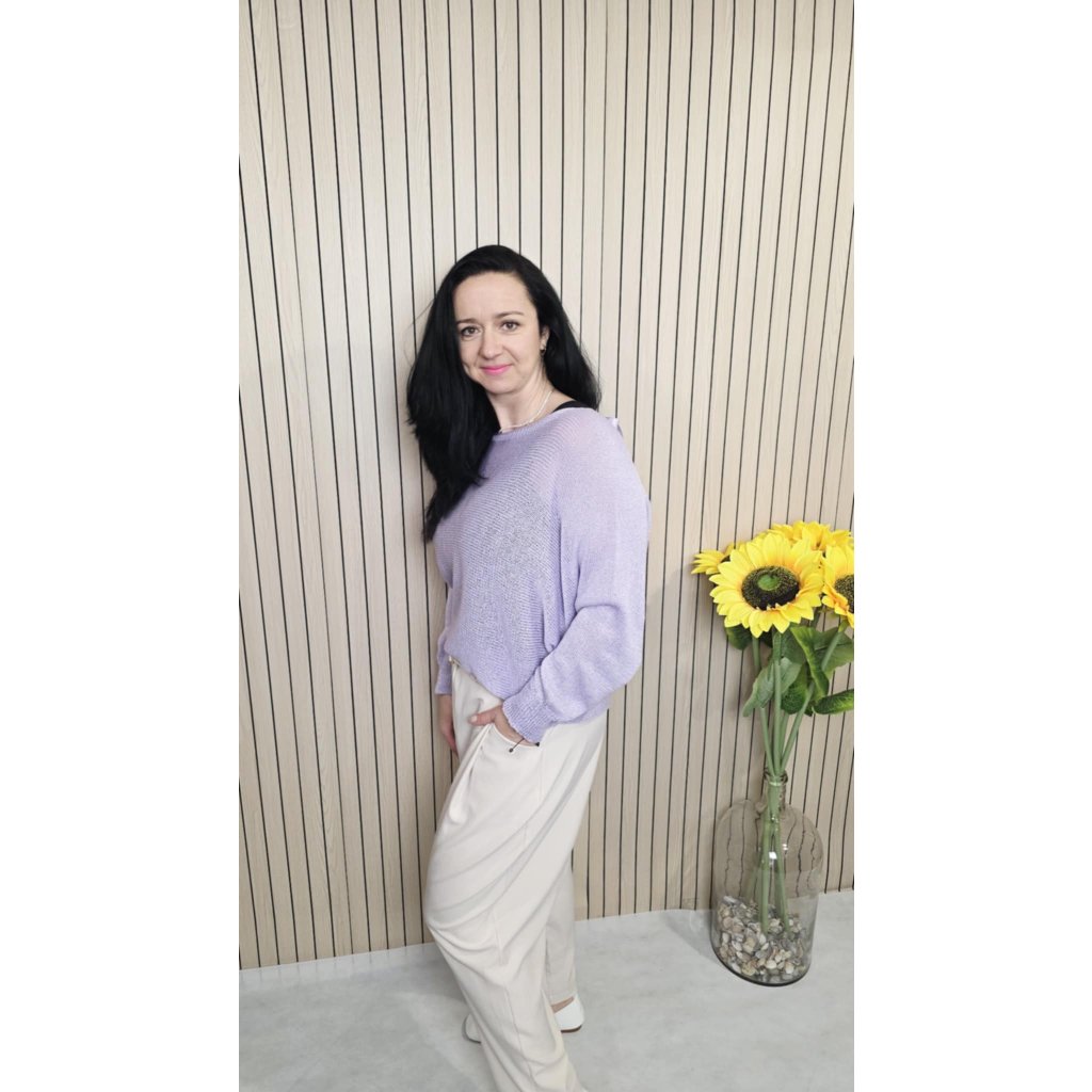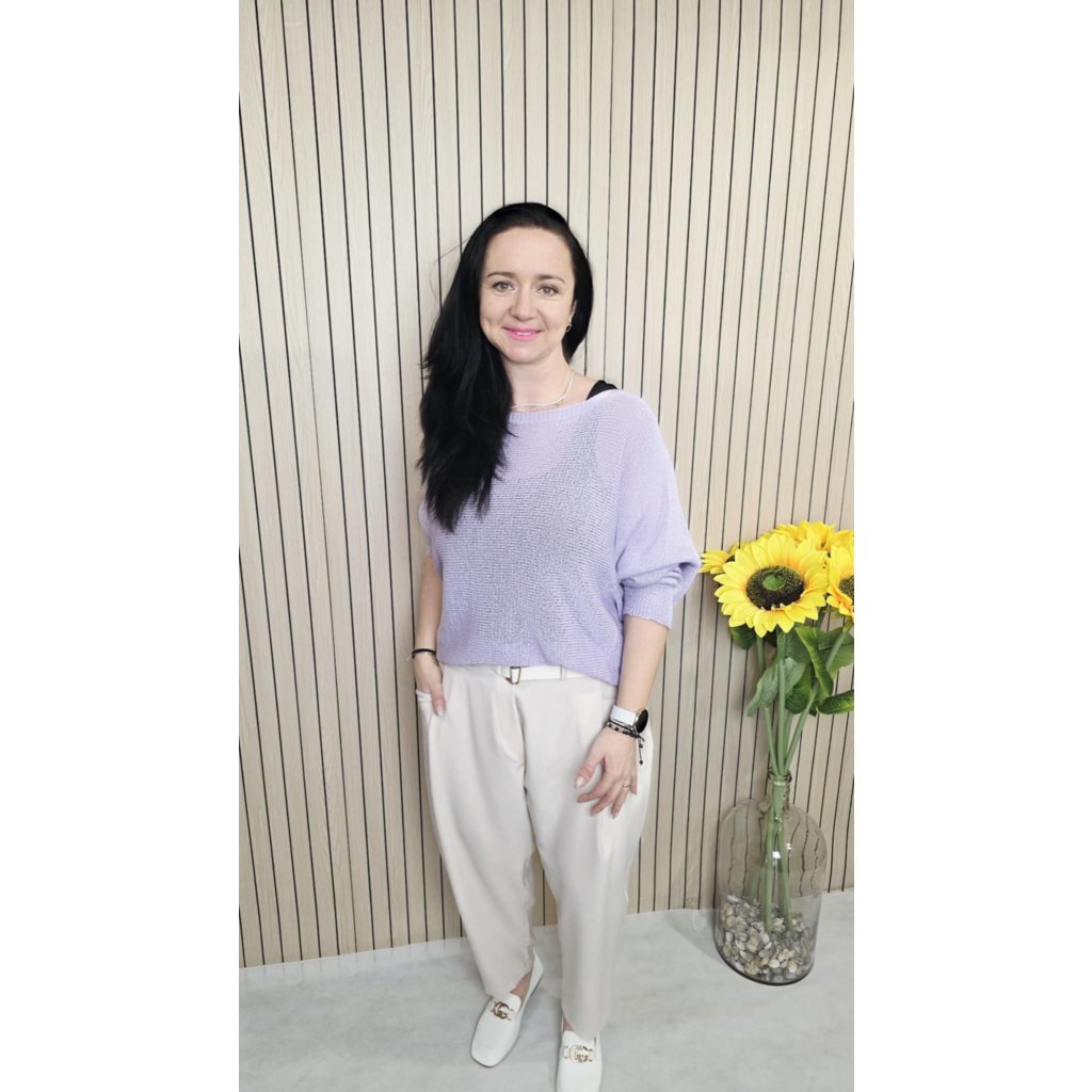 Svetřík je lehce průsvitný, proto je ideální doplnit ho o tílko nebo triko s dlouhým rukávem. Pokud chcete ležérnější vzhled, doporučuji rukávy vykasat – outfit hned působí upraveněji a zároveň nenuceně. Výborně funguje s legínami pro pohodový den, s širšími ležérními kalhotami pro moderní siluetu i se sukní, když chcete jemnější, ženský styling.