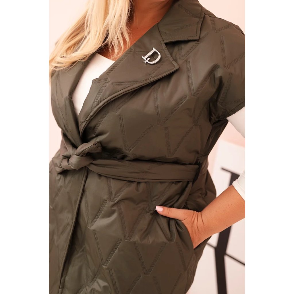 Stylová, prošívaná dámská vesta s páskem je nabídkou pro ženy, které si cení eleganci spojenou s pohodlím. Model s klasickým límcem a dekorativní broží „D” krásně zvýrazňuje siluetu díky přiloženému pásku, který lze regulovat v pase. Prošívaný materiál s geometrickým vzorem dodává celku moderní charakter a délka po kolena zajišťuje ochranu a komfort v chladnějších dnech.