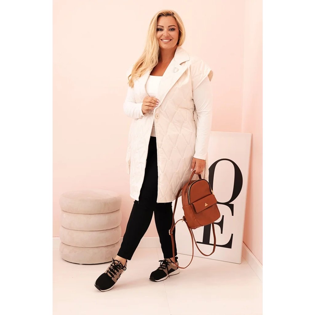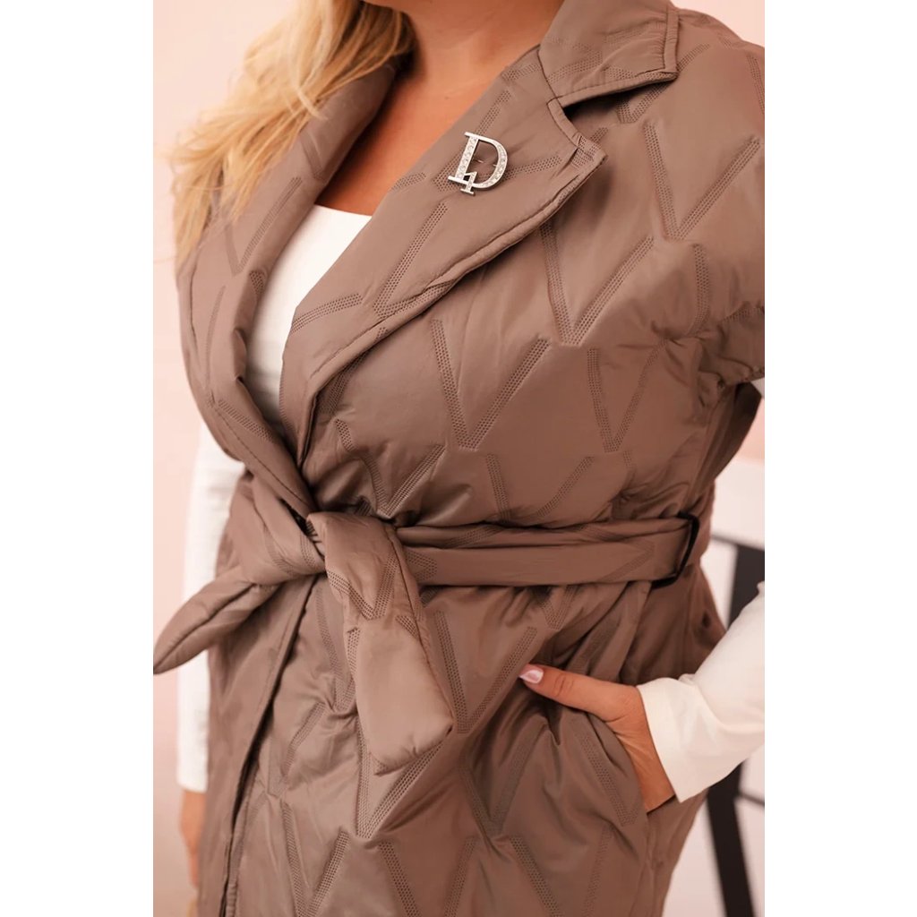 Stylová dámská vesta s páskem z lehkého, prošívaného materiálu s geometrickým vzorem. Elegantní střih bez rukávů, dekorativní brož, široký límec a délka ke kolenům z ní činí ideální doplněk do města i na volný čas. Skvěle sedí dámám ve velikostech XL–3XL.