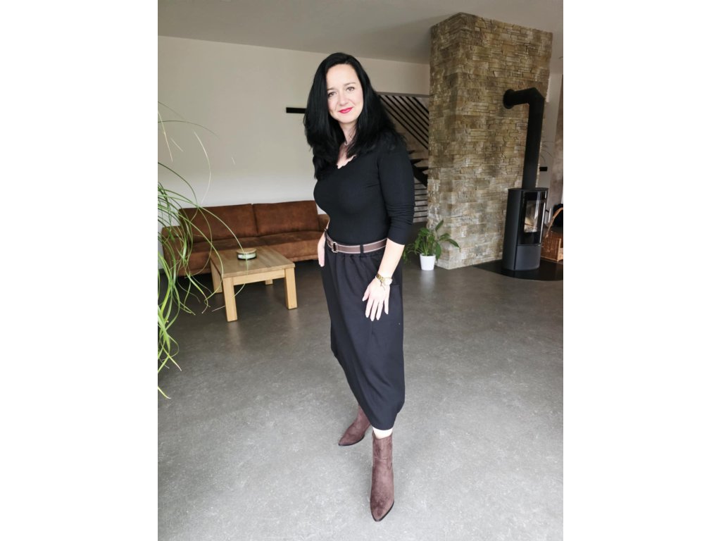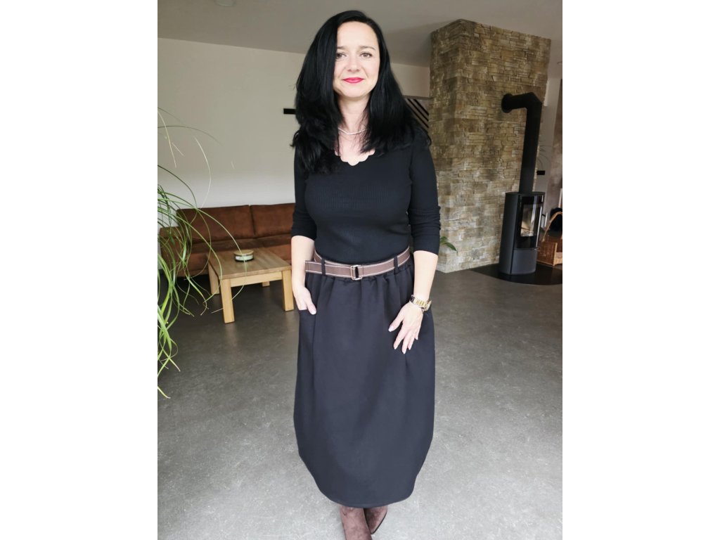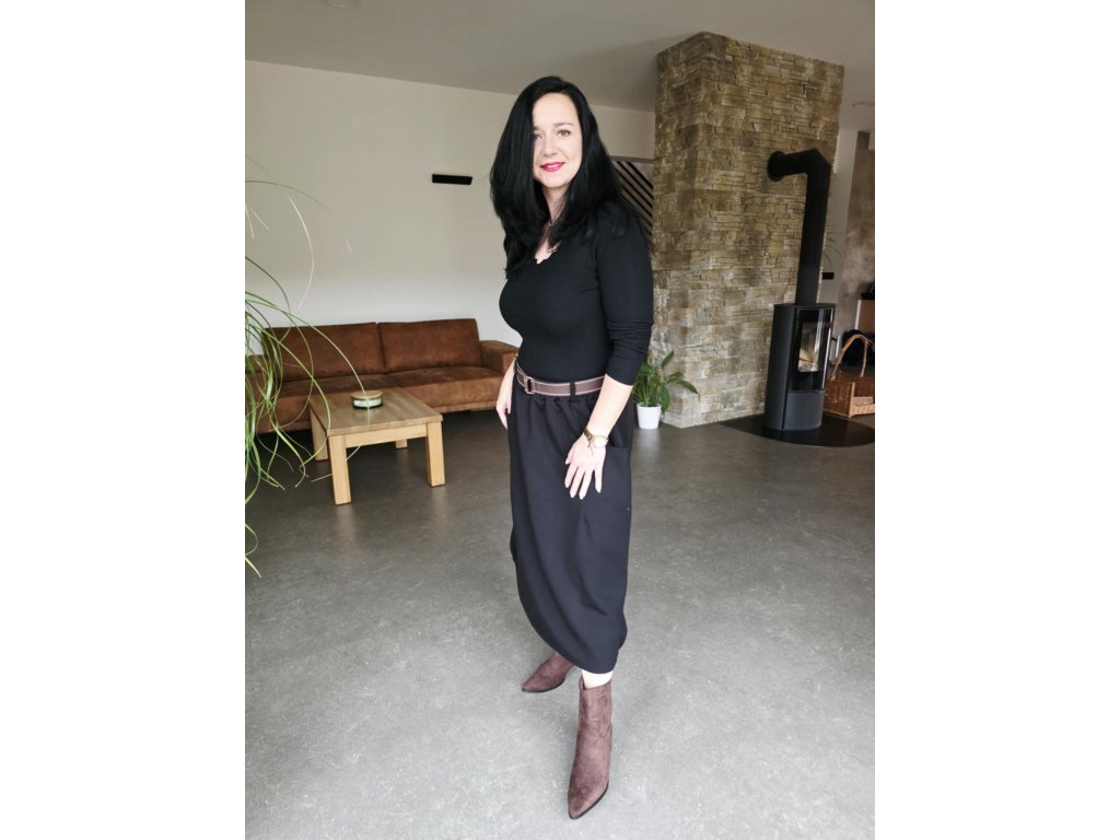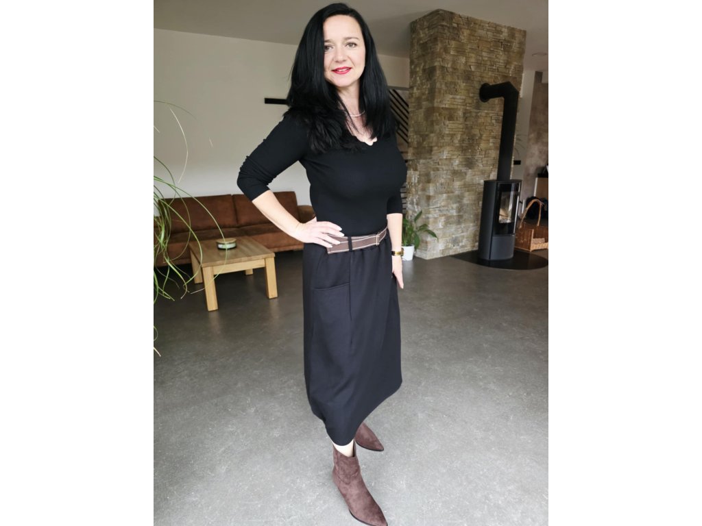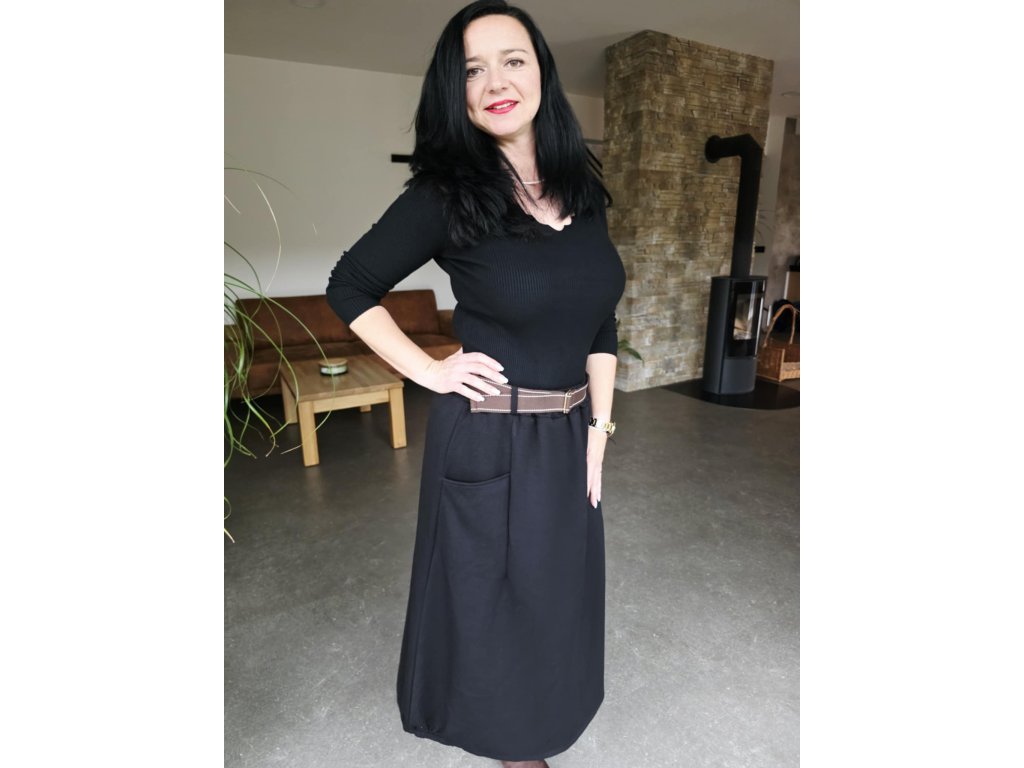 Elegantní midi sukně s kapsami je ideálním kouskem pro podzimní dny. Je ušitá z příjemného, silnějšího materiálu, který krásně drží tvar a zároveň poskytuje pohodlí při nošení. Elastický pas na gumu doplněný hnědým páskem zajistí perfektní přizpůsobení postavě. Na bocích najdete praktické kapsy, které dodávají sukni ležérní nádech. Díky univerzální velikosti sedí na S–XL a působí žensky i elegantně.