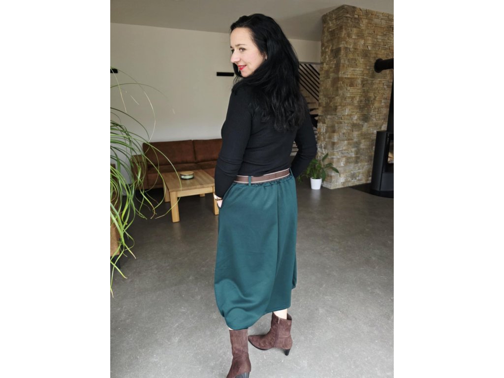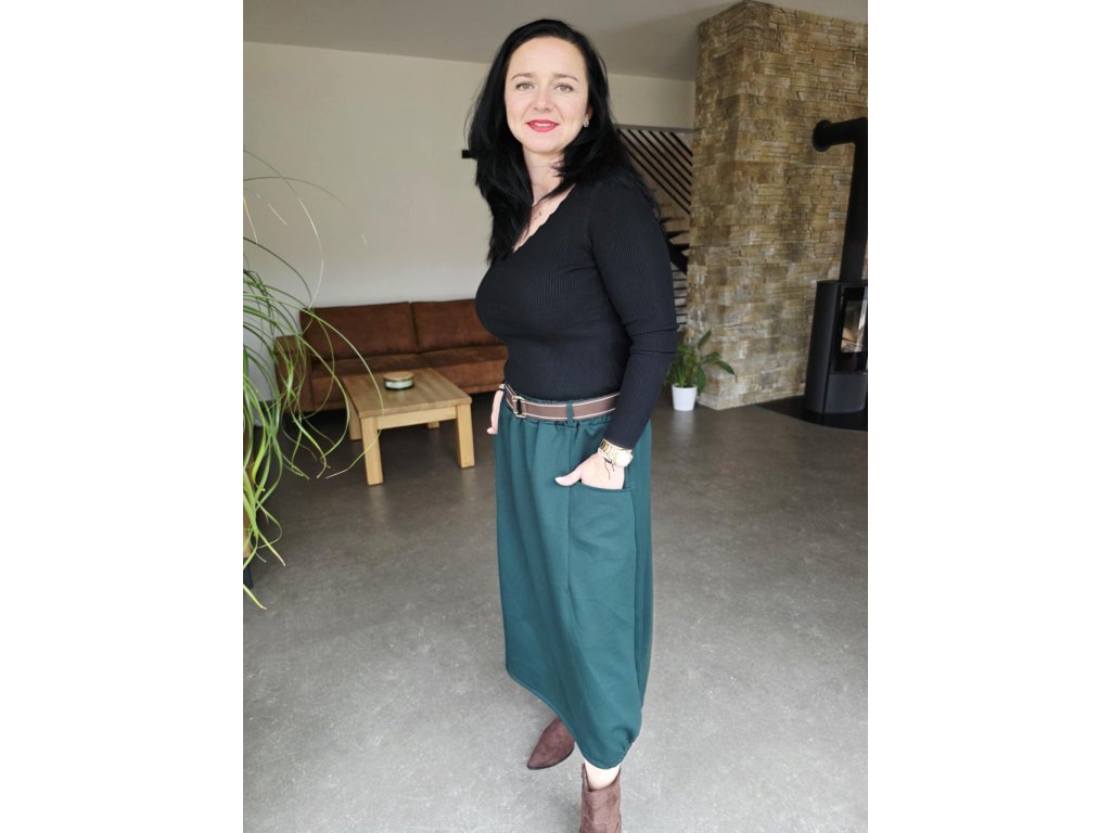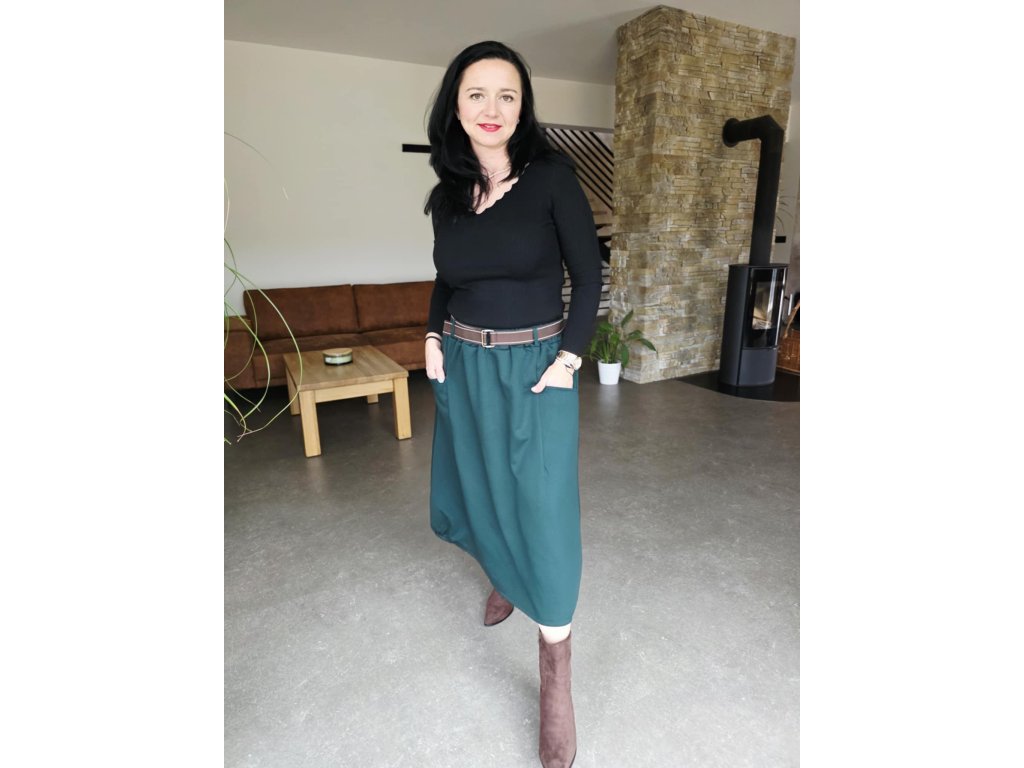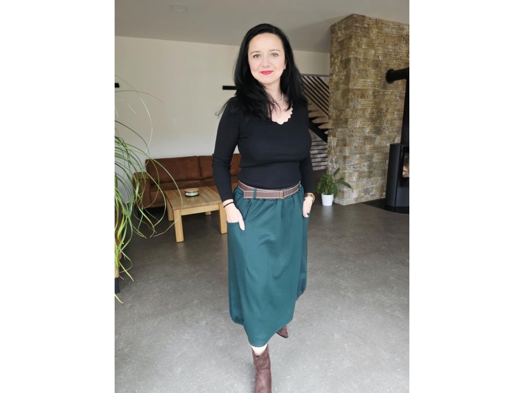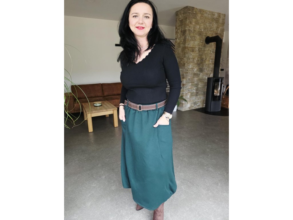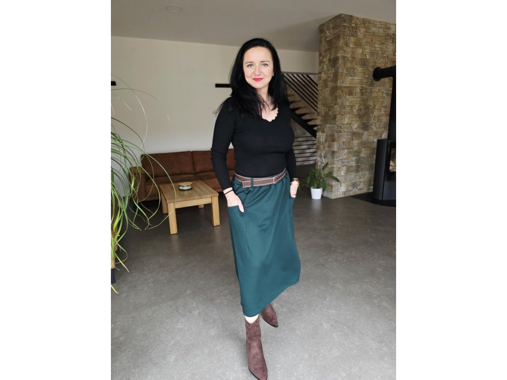 Elegantní midi sukně s kapsami je ideálním kouskem pro podzimní dny. Je ušitá z příjemného, silnějšího materiálu, který krásně drží tvar a zároveň poskytuje pohodlí při nošení. Elastický pas na gumu doplněný hnědým páskem zajistí perfektní přizpůsobení postavě. Na bocích najdete praktické kapsy, které dodávají sukni ležérní nádech. Díky univerzální velikosti sedí na S–XL a působí žensky i elegantně.
