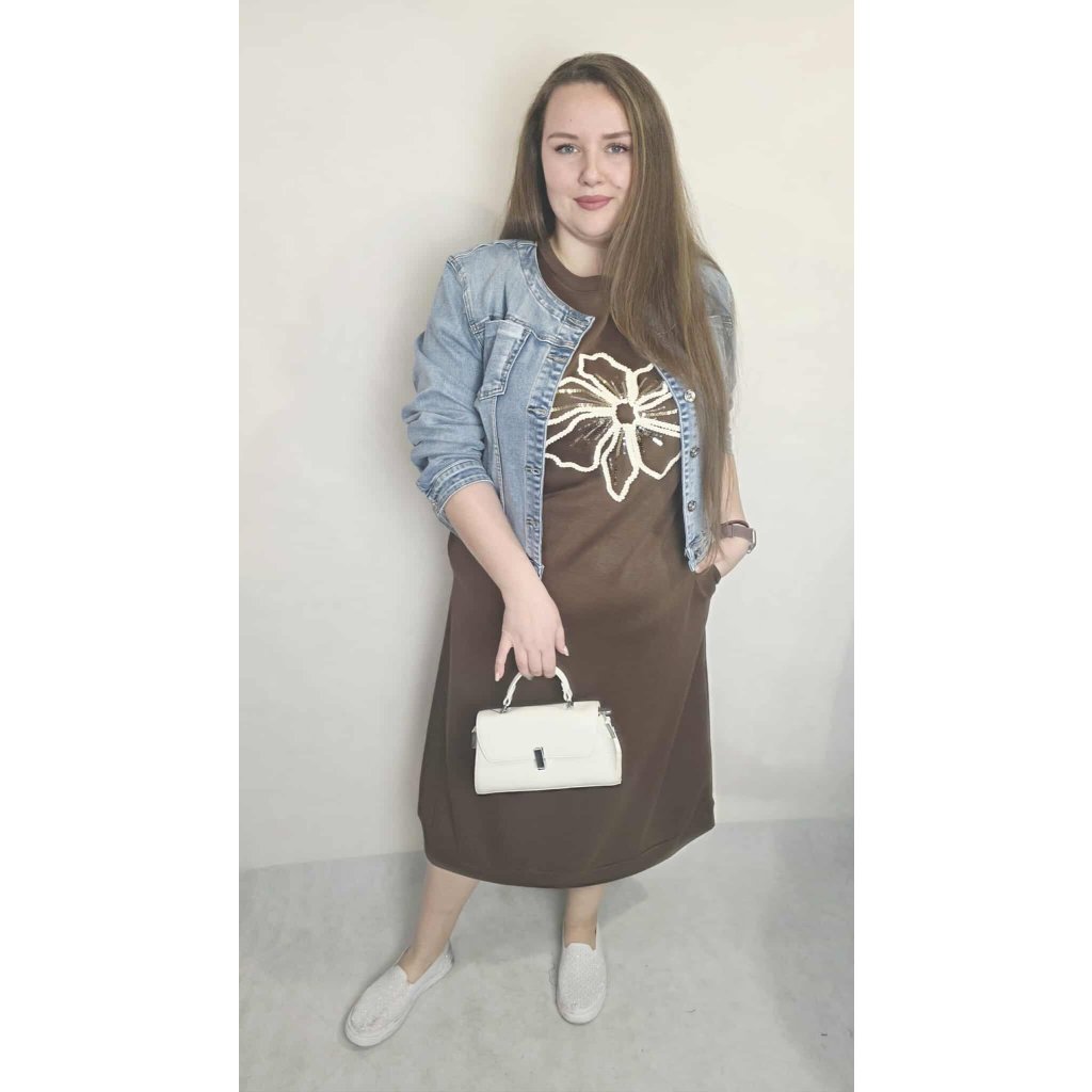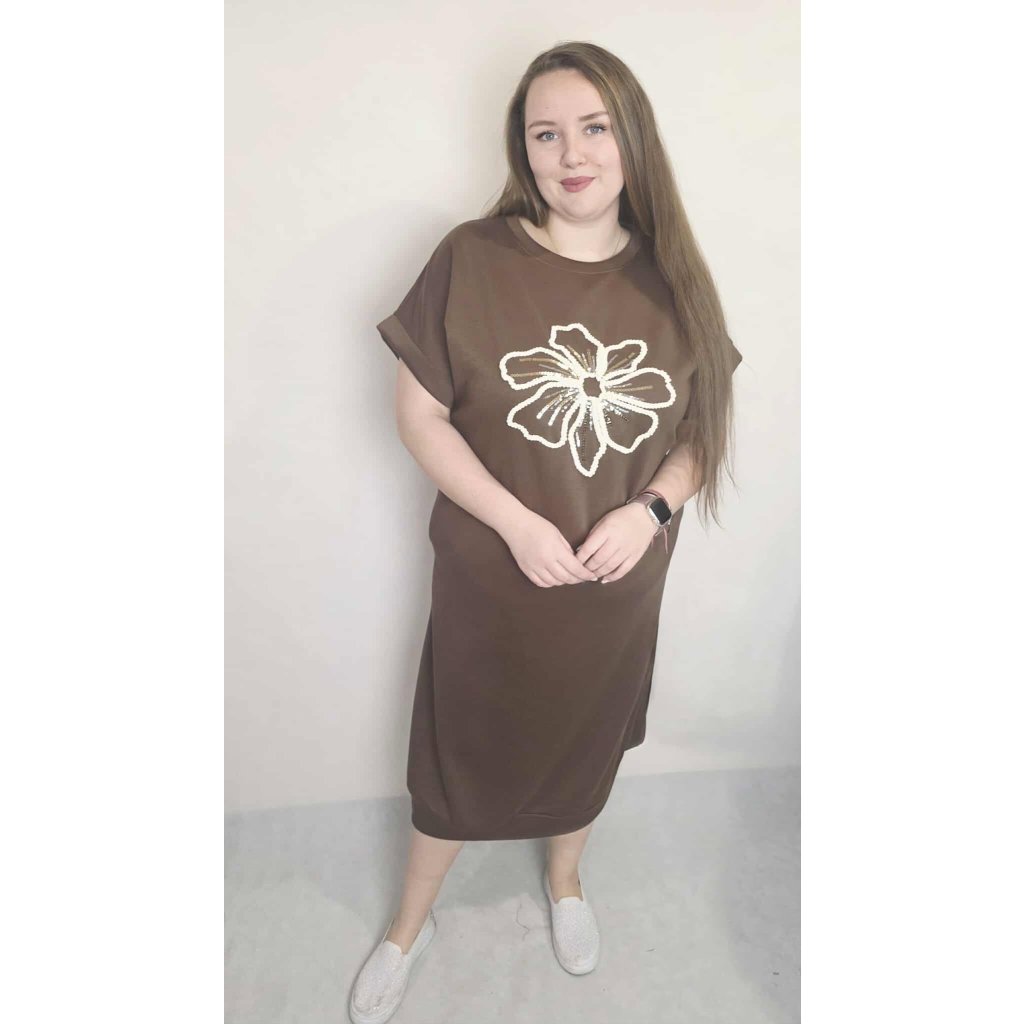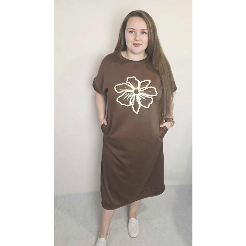 Dlouhé máselkové šaty hnědé Květinová aplikace, boční kapsy, 5 barev