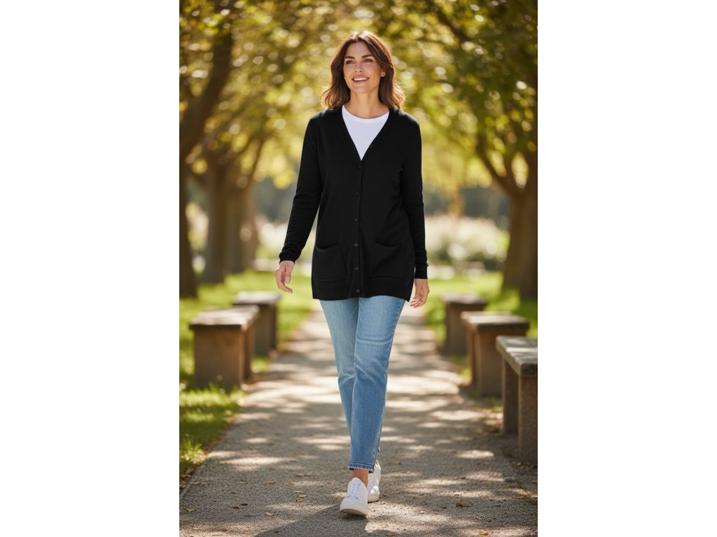 Stylový dlouhý svetr na knoflíky s kapsami – ideální pro chladnější dny. Díky univerzální velikosti (sedí na M–XXL) se pohodlně přizpůsobí různým postavám. Materiál s vysokým podílem modalu a viskózy je měkký, příjemný na dotek a dobře drží tvar.