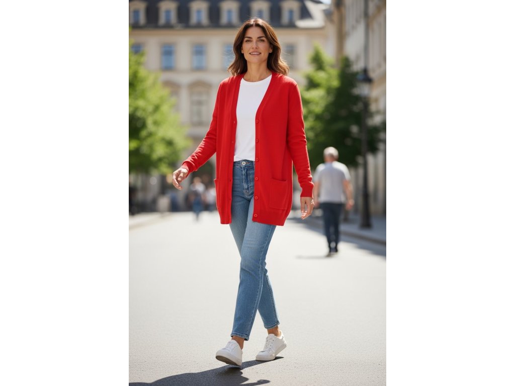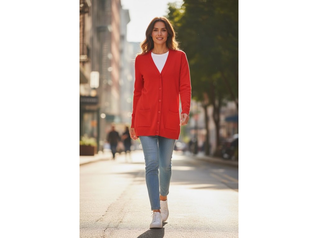 Tento dlouhý svetr na knoflíky je perfektním kouskem pro každodenní nošení i volnočasové outfity. Má pohodlný střih s kapsami, který lichotí postavě a zároveň nabízí dostatek volnosti. Díky měkkému a pružnému materiálu s vysokým podílem modalu a viskózy je svetr velmi příjemný na těle a drží si svůj tvar i po častém nošení.