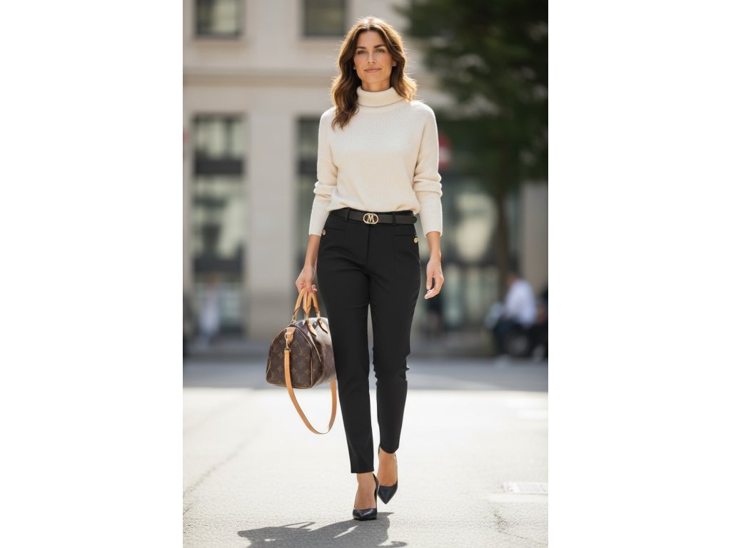 Elegantní kalhoty MEM kombinují komfort a styl v jednom. Jsou vyrobeny z příjemného, pružného materiálu, který se dokonale přizpůsobí postavě. Díky elastickému pasu a přiloženému pásku s kovovou přezkou působí kalhoty žensky a elegantně zároveň. Ozdobné zlaté knoflíky u kapes dodávají modelu luxusní vzhled.