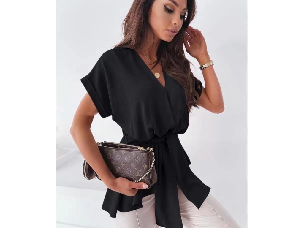 Tato tunika kombinuje elegantní vzhled a pohodlí. Má lehce prodlouženou zadní stranu, která dodává moderní šmrnc, a pásek ve stejné barvě pro doladění celkového vzhledu. Výstřih ve tvaru véčka spolu s gumičkou v pase krásně zvýrazní vaši postavu a zajistí pohodlné nošení. Vhodná pro velikosti XS–L. Rozměry: prsa 100 cm, pas 88–92 cm, délka přední 63 cm, délka zadní 74 cm. Perfektní k legínám nebo džínám pro ležérní i elegantní outfit.