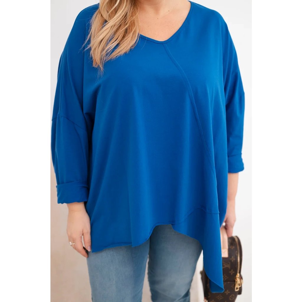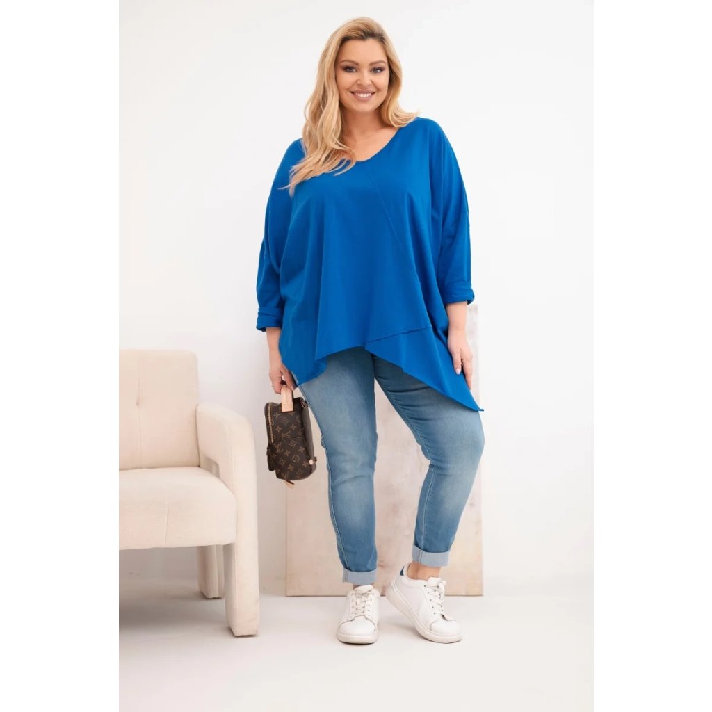 Dámská bavlněná blůza Plus Size s asymetrickým lemem a výstřihem do V chabrová
