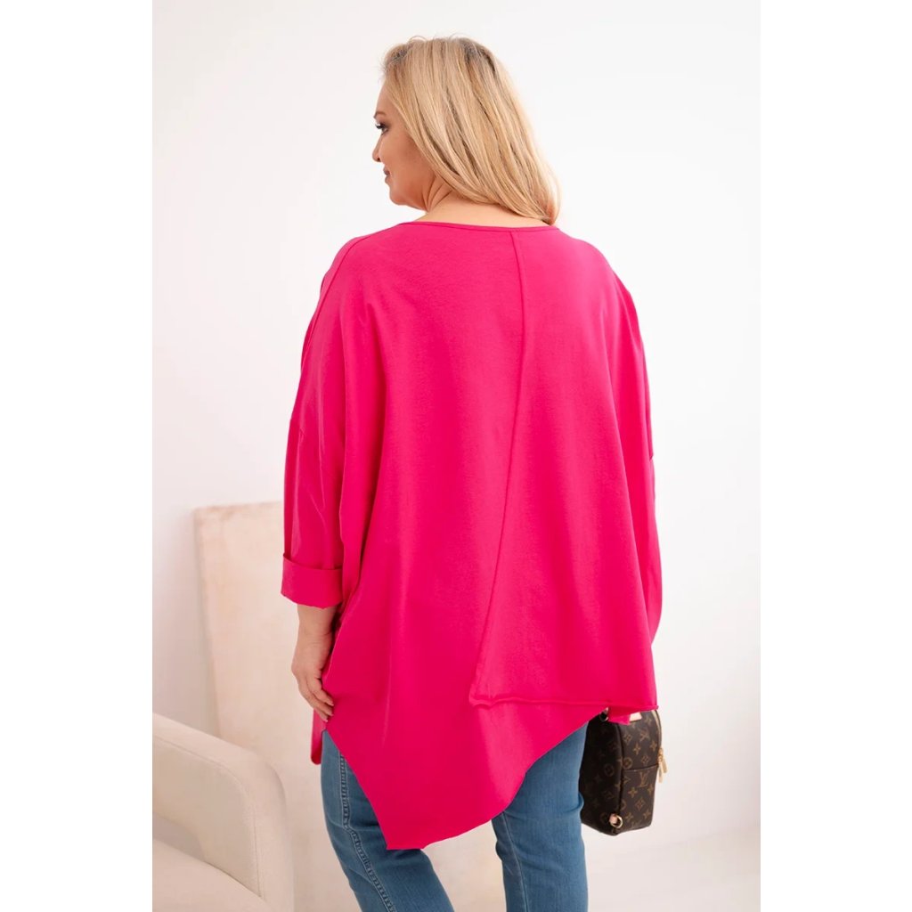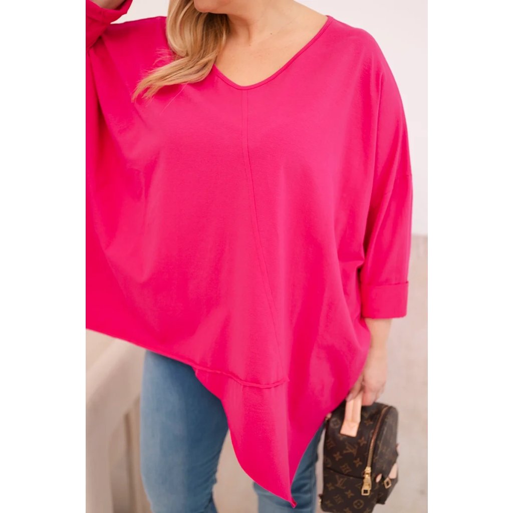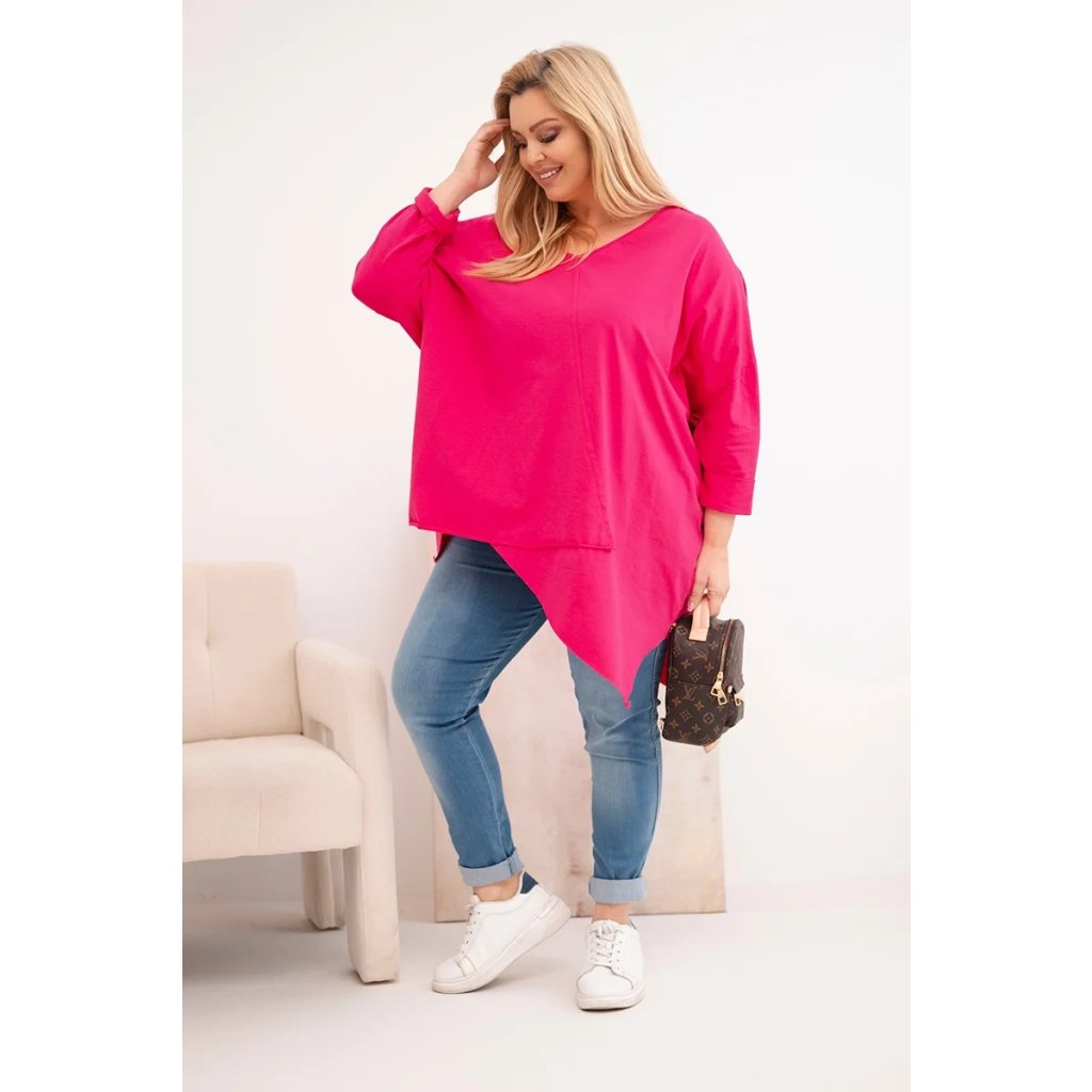 Dámská bavlněná blůza Plus Size s asymetrickým spodním lemem a výstřihem do V fuchsie