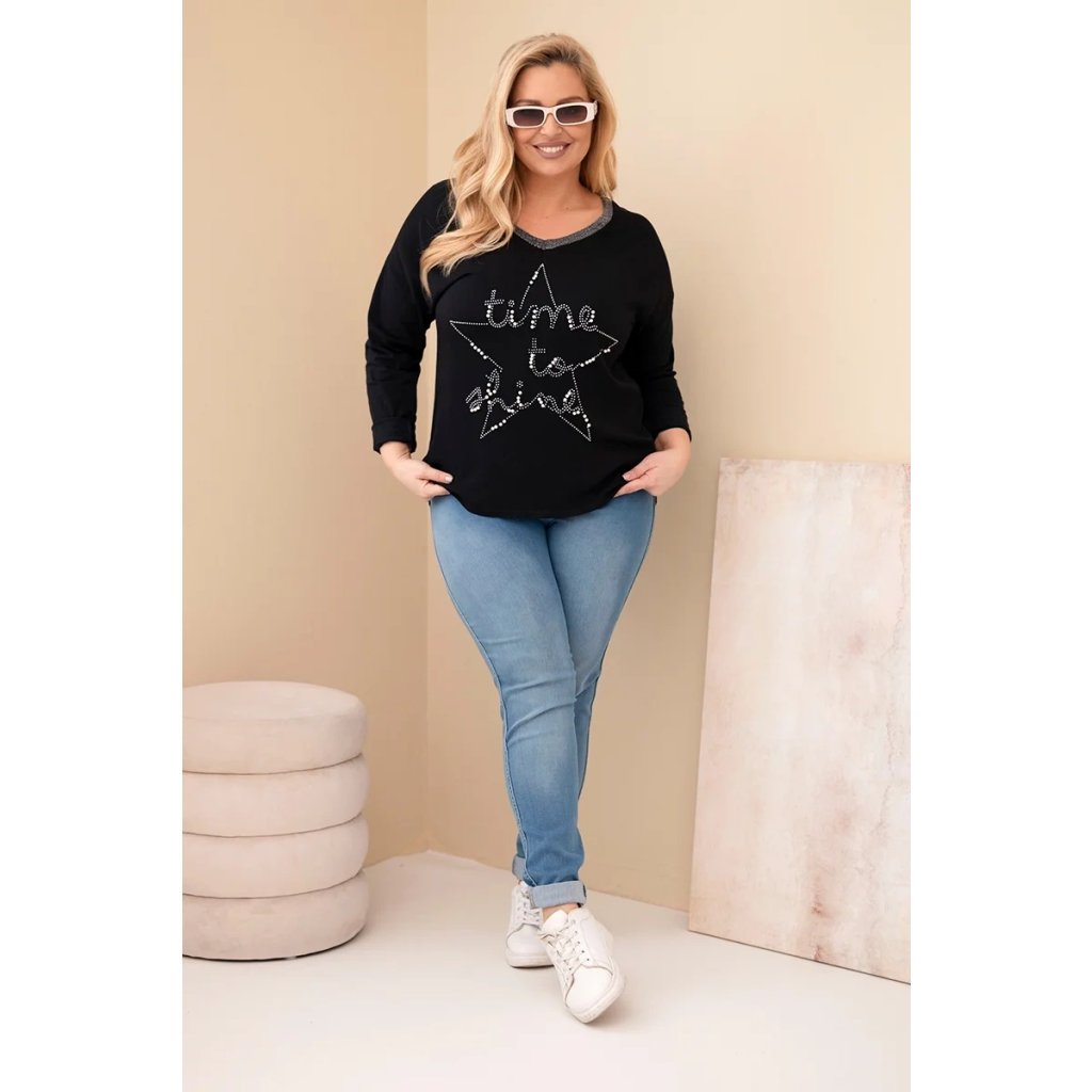 Stylová a ženská dámská blůza s nápisem „Time to Shine“, který je zasazen do tvaru hvězdy, ozdobená drobnými perličkami a lesklými kamínky, je ideální volbou pro ženy, které mají rády jemný lesk a originální detaily v každodenních stylizacích. Výstřih do V krásně zvýrazňuje krk a delší zadní část dodává celku lehkost a komfort.