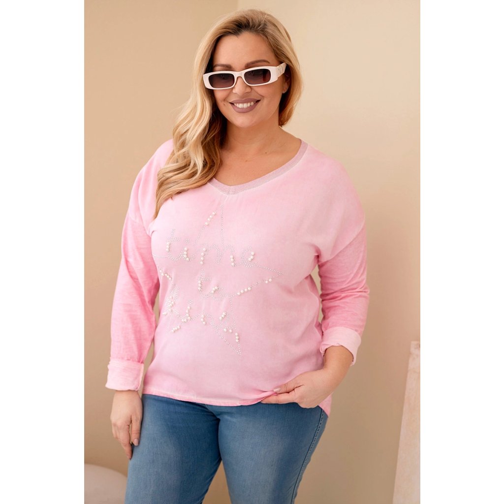 Dámská blůza Plus Size s potiskem a perlami světle růžová