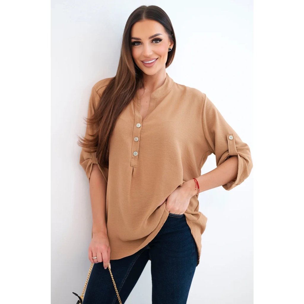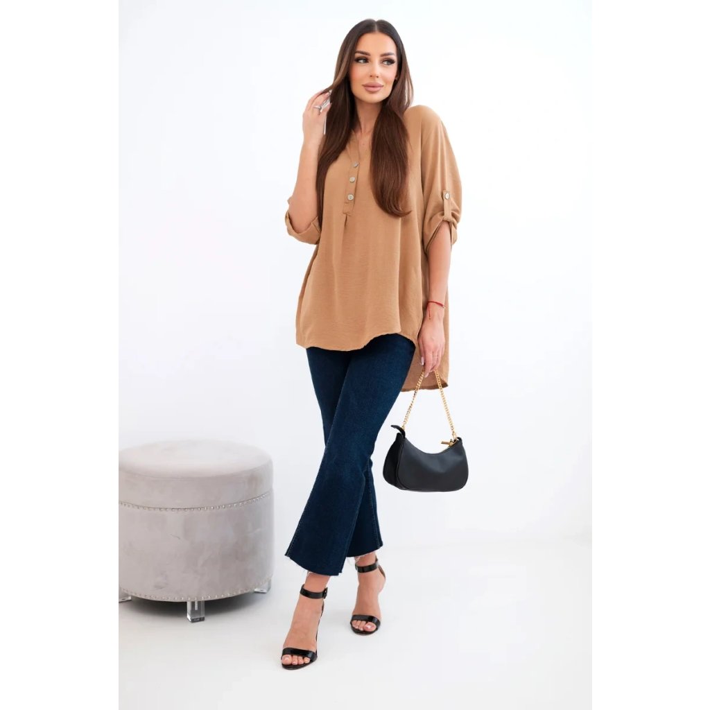 Objevte mimořádnou eleganci a pohodlí v prezentované halence s delšími zády, knoflíkovým výstřihem a ohrnutými rukávy, tato halenka nejen vypadá výjimečně stylově, ale poskytuje také bezkonkurenční funkčnost. Ciťte se sebevědomě a elegantně v halence, která podtrhne váš jedinečný styl. Díky delším zadním dílům vytvoříte jemné a módně nepravidelné proporce a knoflíkový výstřih vám umožní upravit si halenku podle vašich preferencí. Vyhrnuté rukávy dodávají halence lehkost a ležérní charakter, ideální pro různé příležitosti. Ať už se jedná o obchodní jednání nebo relaxační kávu s přáteli, naše halenka vám poskytne pohodlí a styl v jednom. Nenechte si ujít příležitost přidat do svého šatníku tuto jedinečnou halenku! Objevte eleganci, pohodlí a funkčnost v jednom a zdůrazněte svůj jedinečný styl ještě dnes. Velikost je univerzální a bude vhodná pro ženy, které nosí velikost S, M nebo L.