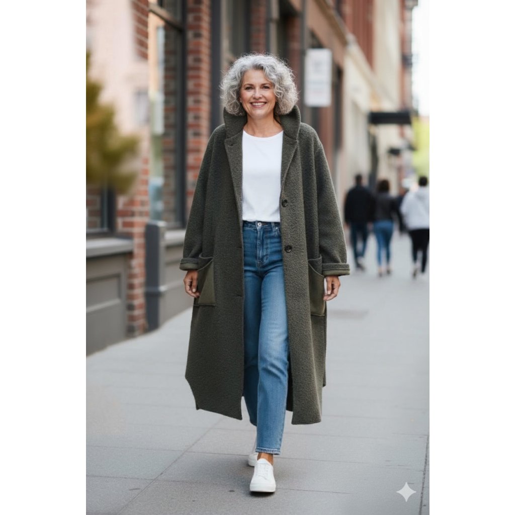 Volný střih se spadlými rameny a délkou pod lýtka dokáže s postavou zázraky. Kabát zakryje bříško, širší boky, zadeček i stehna, opticky postavu zeštíhlí a protáhne. Je ideální pro ženy, které chtějí pohodlí i styl – ať je vám 30, 40 nebo 60+, v tomto střihu působí silueta uvolněně a moderně.