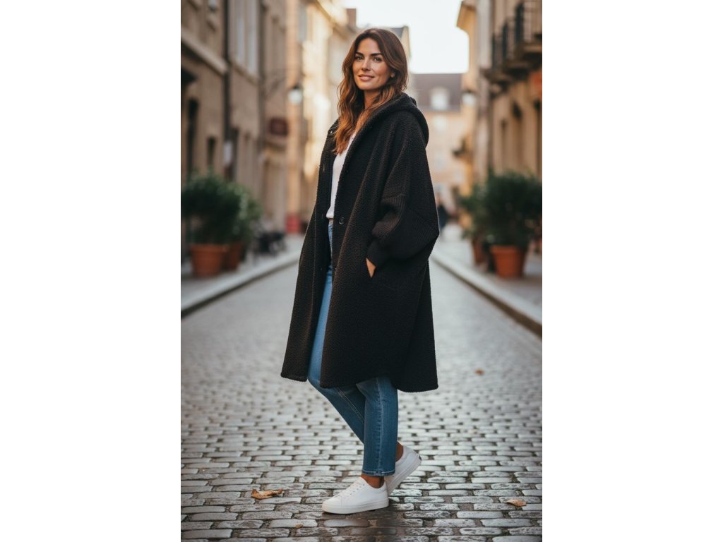 Elegantní a hřejivý oversize kabát LEONARDO je perfektní volbou pro ženy, které mají rády pohodlí, styl a volnost pohybu. Kabát je navržen v moderním volném střihu s kapucí, velkými dekorativními knoflíky a bočními kapsami, které dodávají celkovému vzhledu ležérní eleganci.