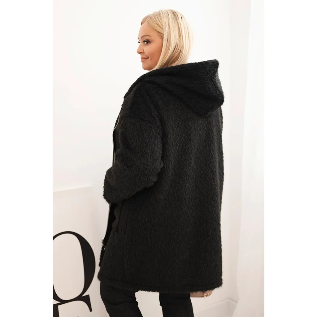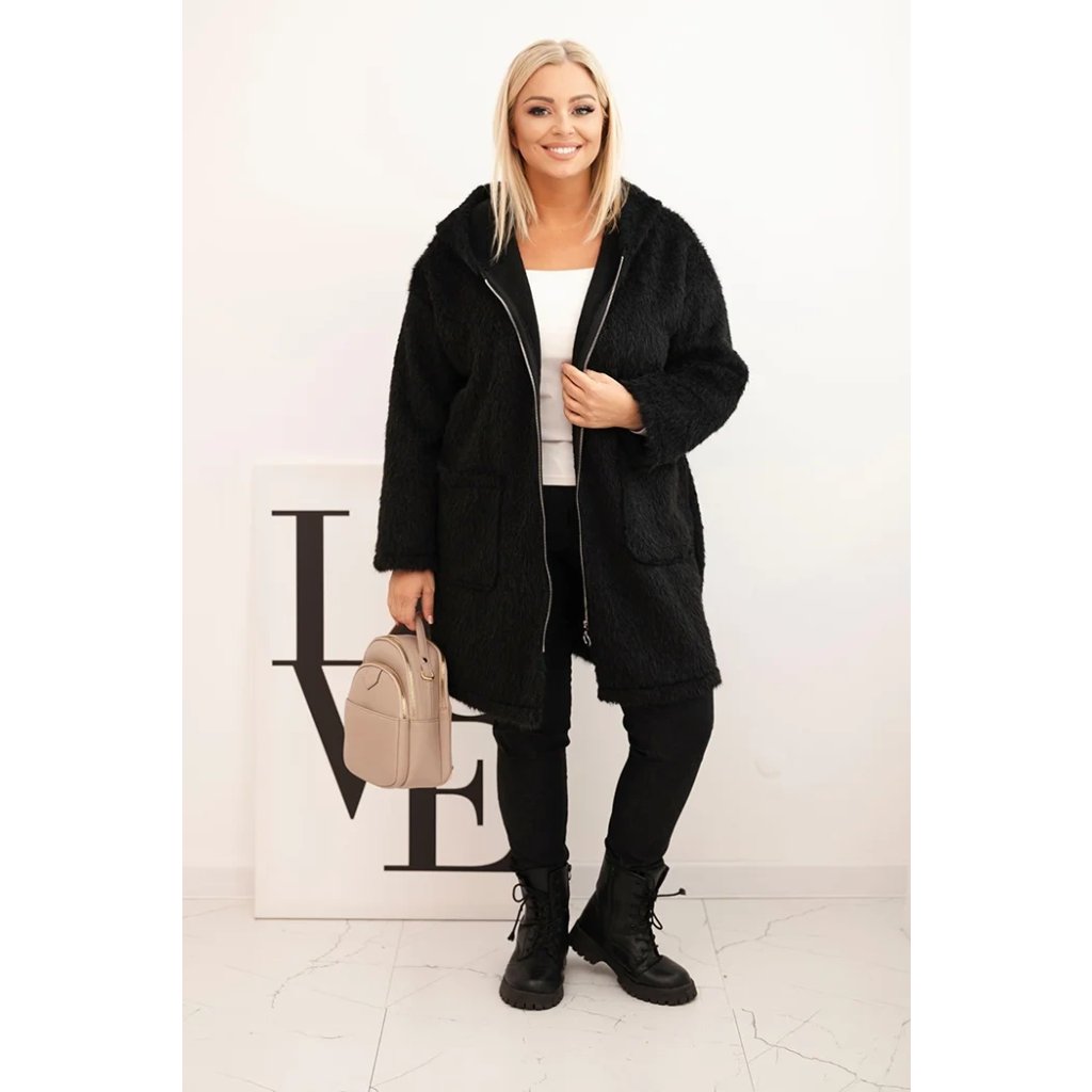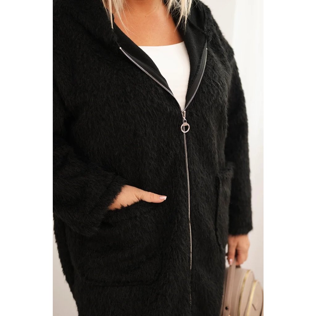 Huňatý oversize kabát s kapucí a zapínáním na zip černý