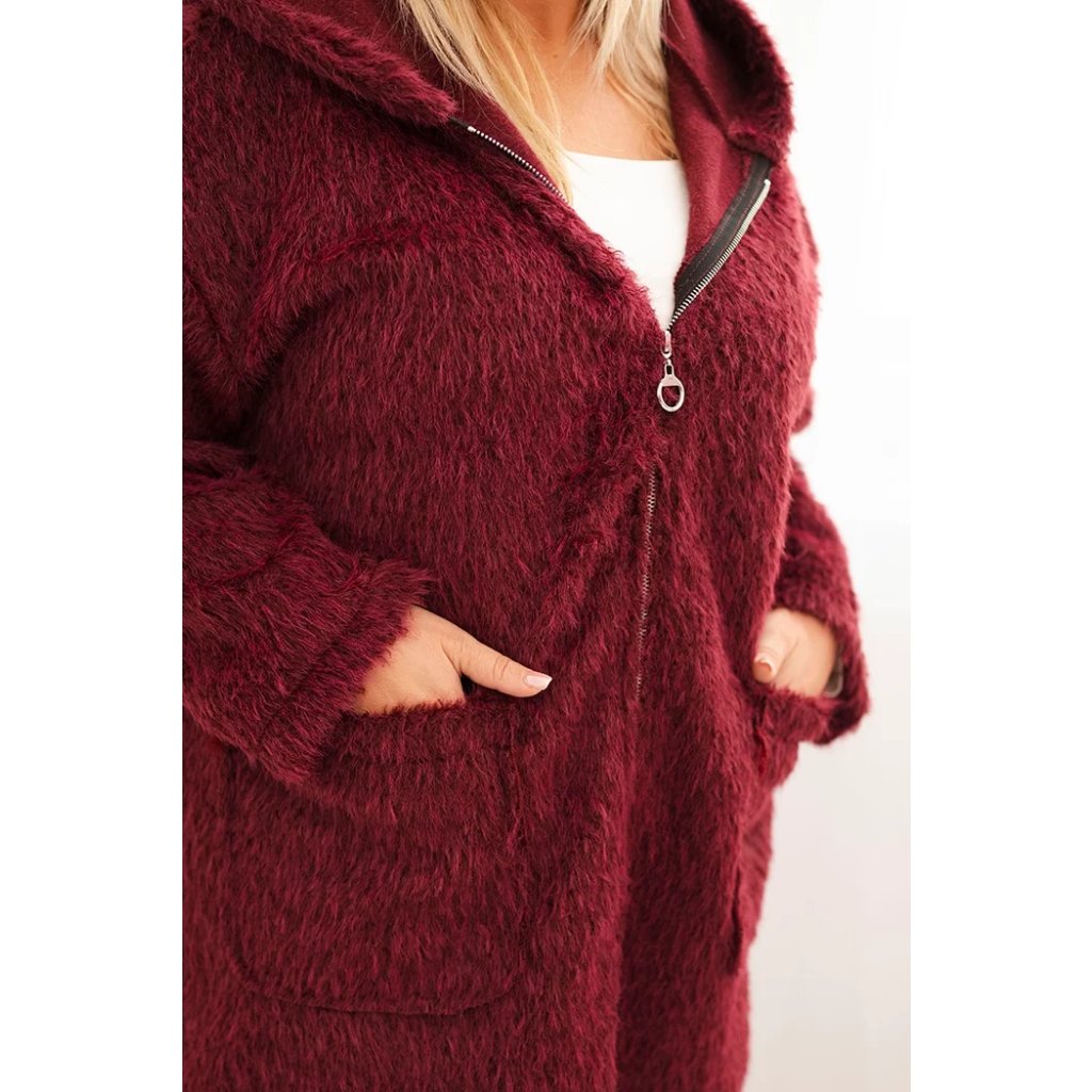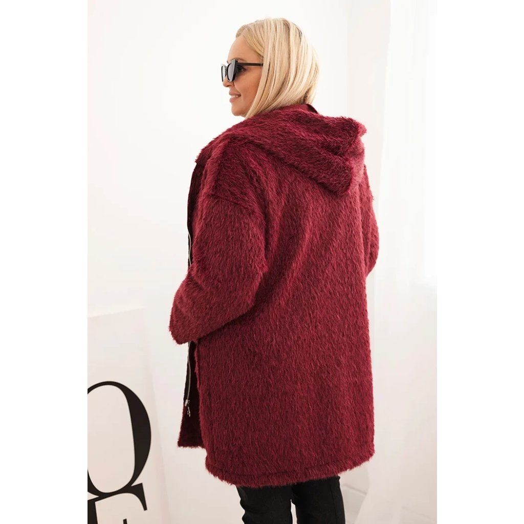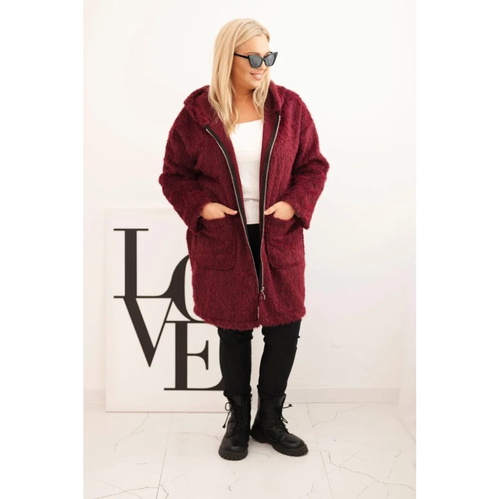 Huňatý oversize kabát s kapucí a zapínáním na zip švestkový