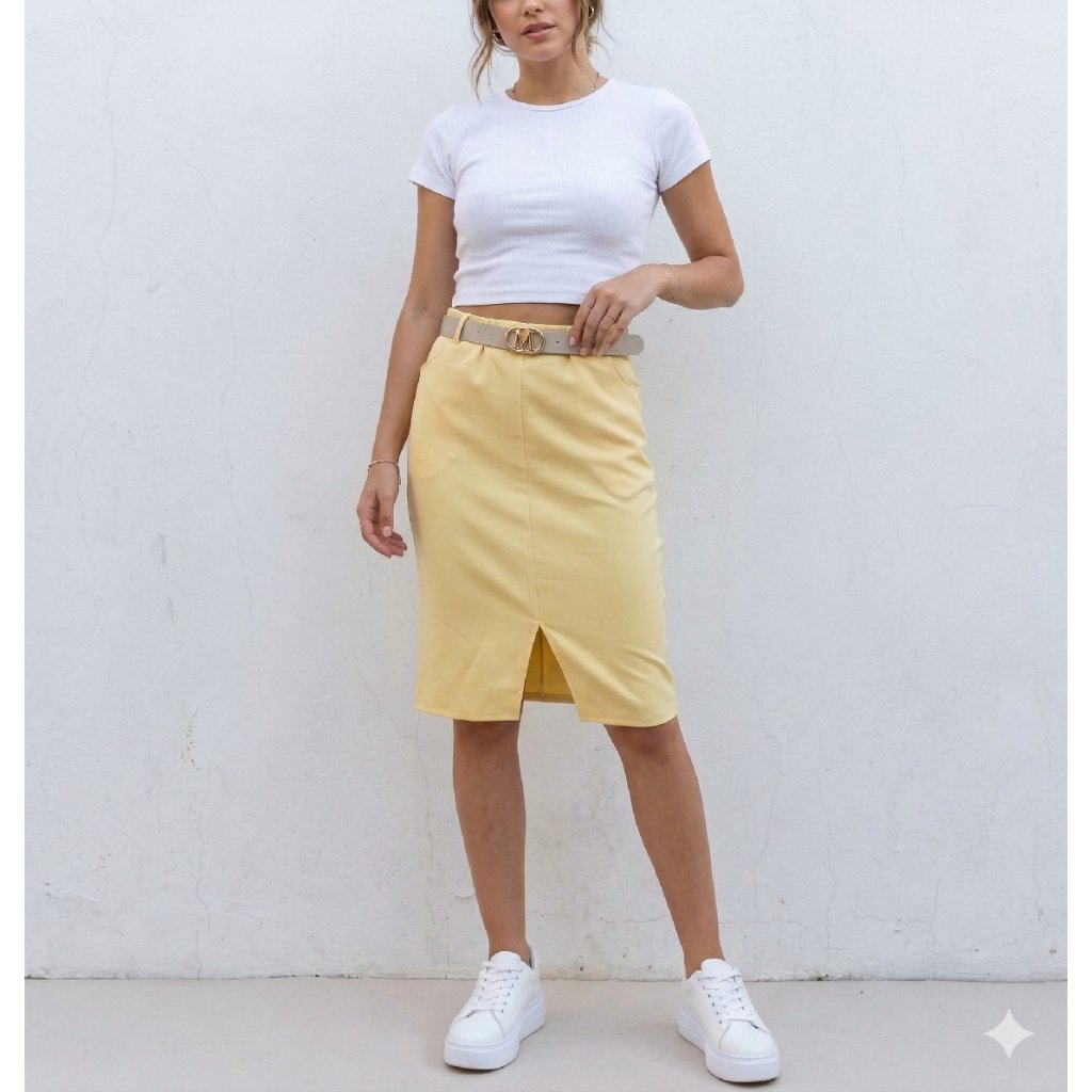 Máslová sukně MIMI s páskem žlutá Pouzdrový střih, přední rozparek, pružný materiál