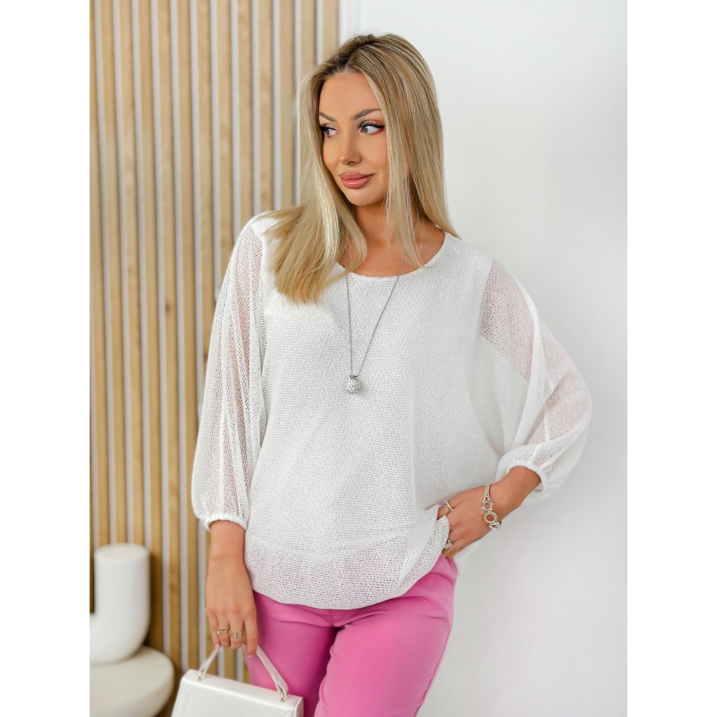 Vzdušný dámský svetřík s balonkovým lemem a náhrdelníkem bílý s tříčtvrtečními rukávy, balonkovým lemem a stříbrným přívěskem