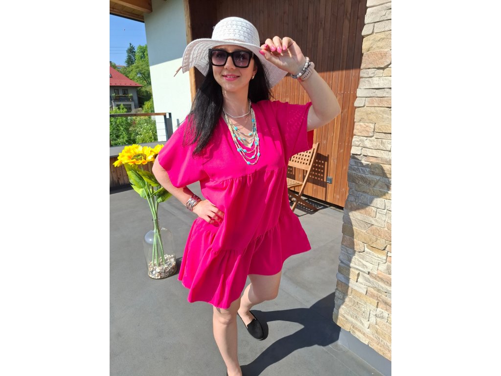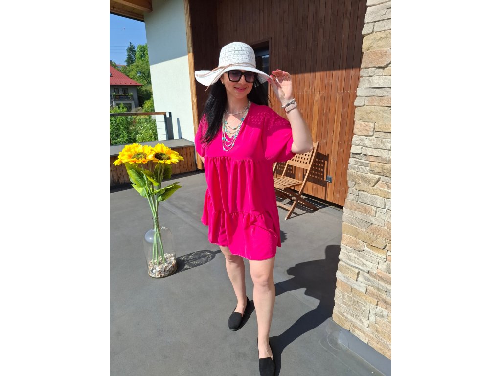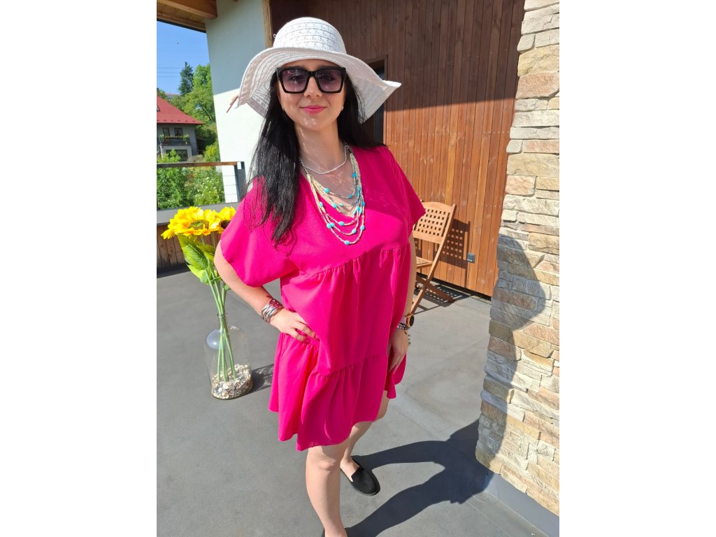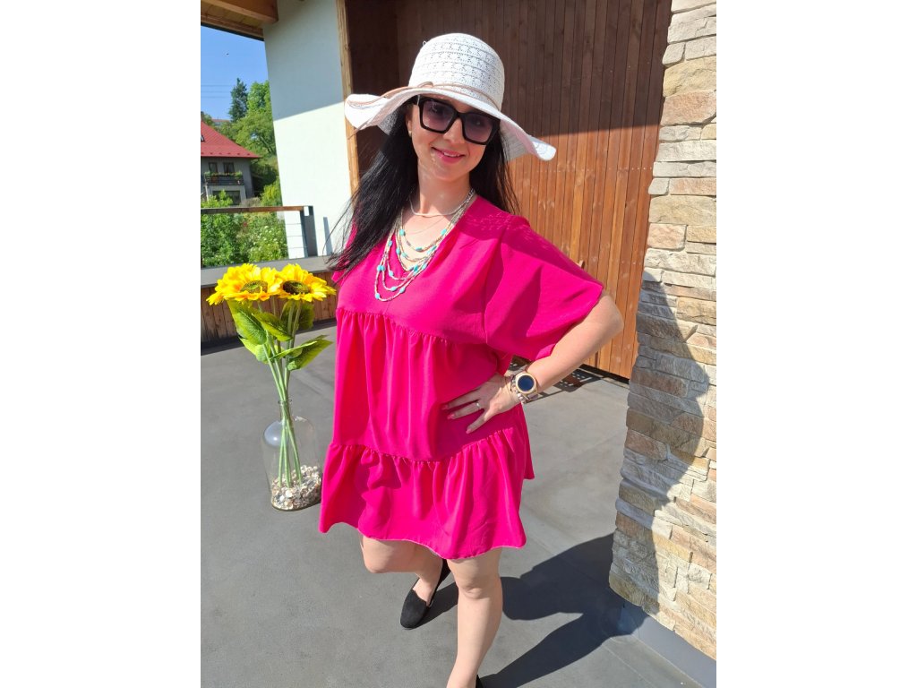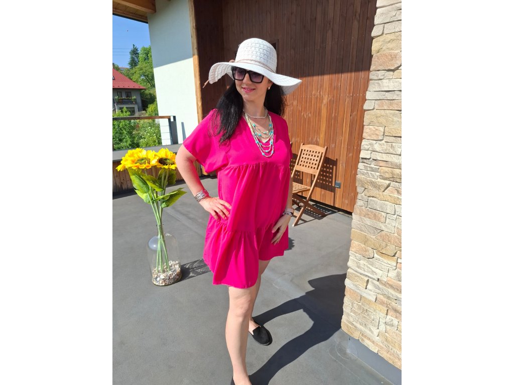 Tyto letní šaty MAGDA jsou ideální pro teplé dny. Volný střih s výstřihem do V a krátkými rukávy zajišťuje pohodlné nošení a lichotí každé postavě. Volánový vzhled dodává šatům ženský šmrnc, zatímco příjemný vzdušný materiál ze 100 % polyesteru zaručuje lehkost a vzdušnost. Vhodné pro velikosti XS–XXL. Rozměry: prsa 120 cm, boky 156 cm, délka 92 cm. Skvělé pro letní dny, dovolenou nebo ležérní nošení.