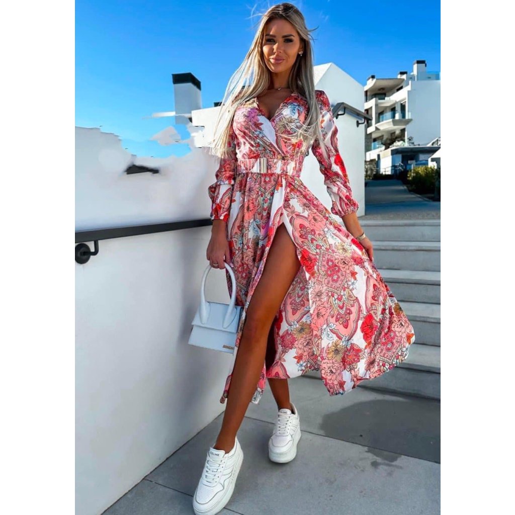 Tyto dlouhé šaty s elegantním vzorem jsou ušity z lehkého a příjemně vzdušného materiálu, který vám zaručí maximální pohodlí. Mají výstřih do véčka, stylový rozparek a v pase je zdobí pásek ve stejném designu jako samotné šaty – vše dokonale sladěné. Díky univerzální velikosti skvěle padnou každé postavě od XS až po L.