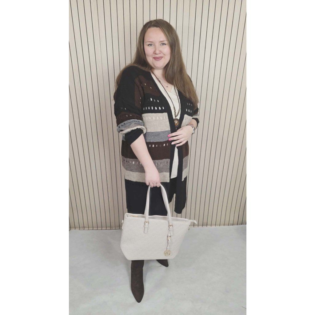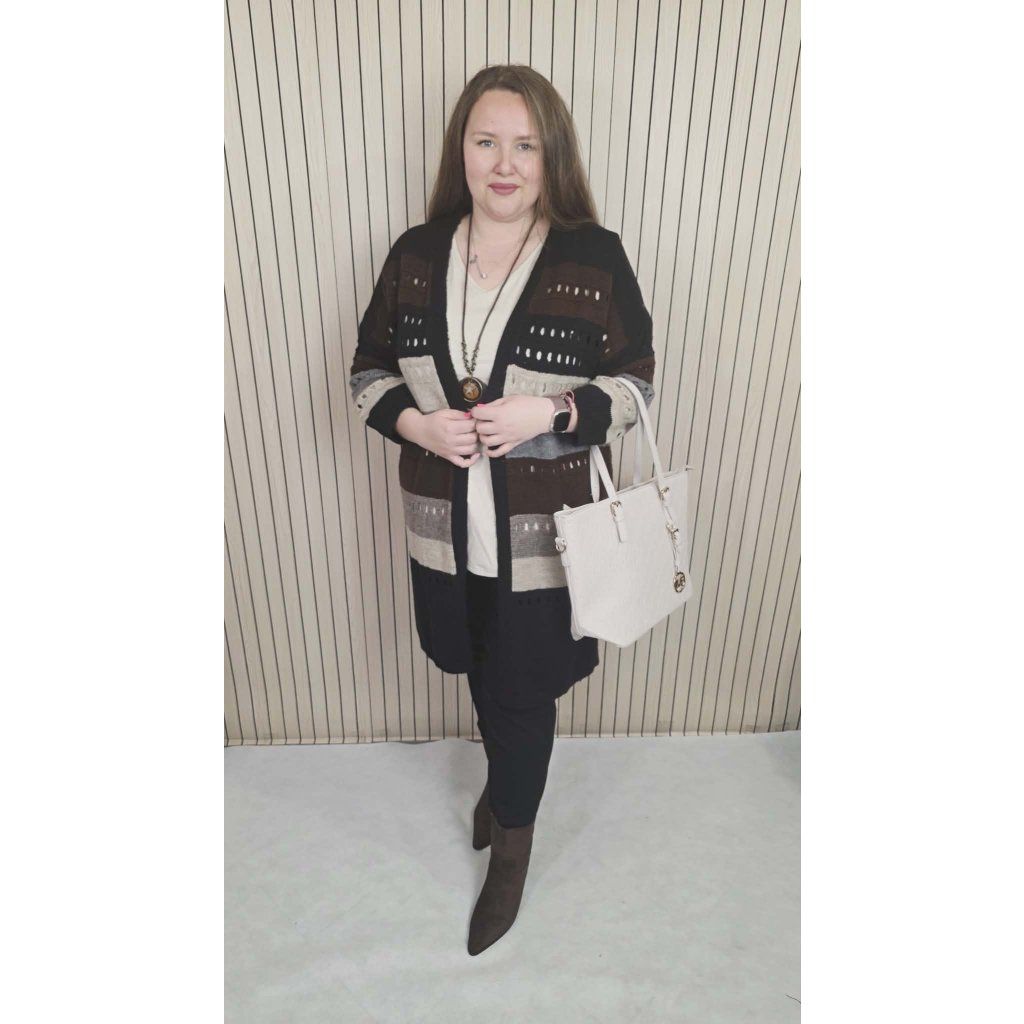 Tento dlouhý barevný kardigan je neuvěřitelně variabilní. Skvěle vypadá v kombinaci s klasickými džínami a bílým tričkem pro volný čas, ale ostudu neudělá ani přes jednobarevné šaty nebo úzké kalhoty do práce. Je to ideální "přehazovačka" na ranní chladné cesty do zaměstnání nebo na večerní procházky.