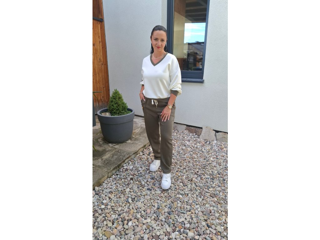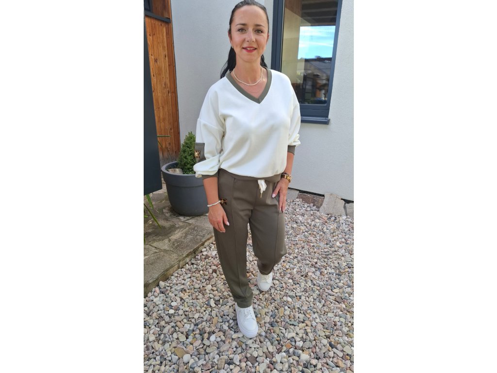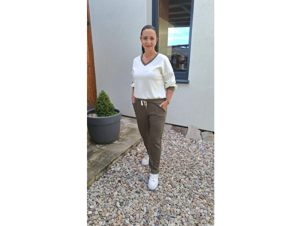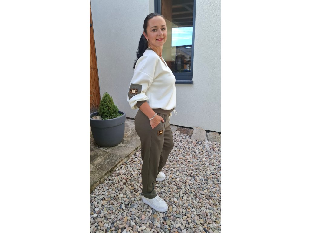 Stylová dvoudílná souprava v elegantní bílé barvě je ideální volbou pro pohodlné i moderní nošení. Mikina volného střihu s výstřihem do V je zakončena lemy ve stejné barvě jako tepláky, má dlouhé rukávy a na jednom z nich výraznou ozdobnou kapsičku, která dodává celku sportovně-ležérní charakter. Kalhoty jsou navrženy pro maximální komfort – v pase mají gumu s nastavitelnou tkaničkou, elegantní puky, praktické boční kapsy a pohodlný rovný střih.