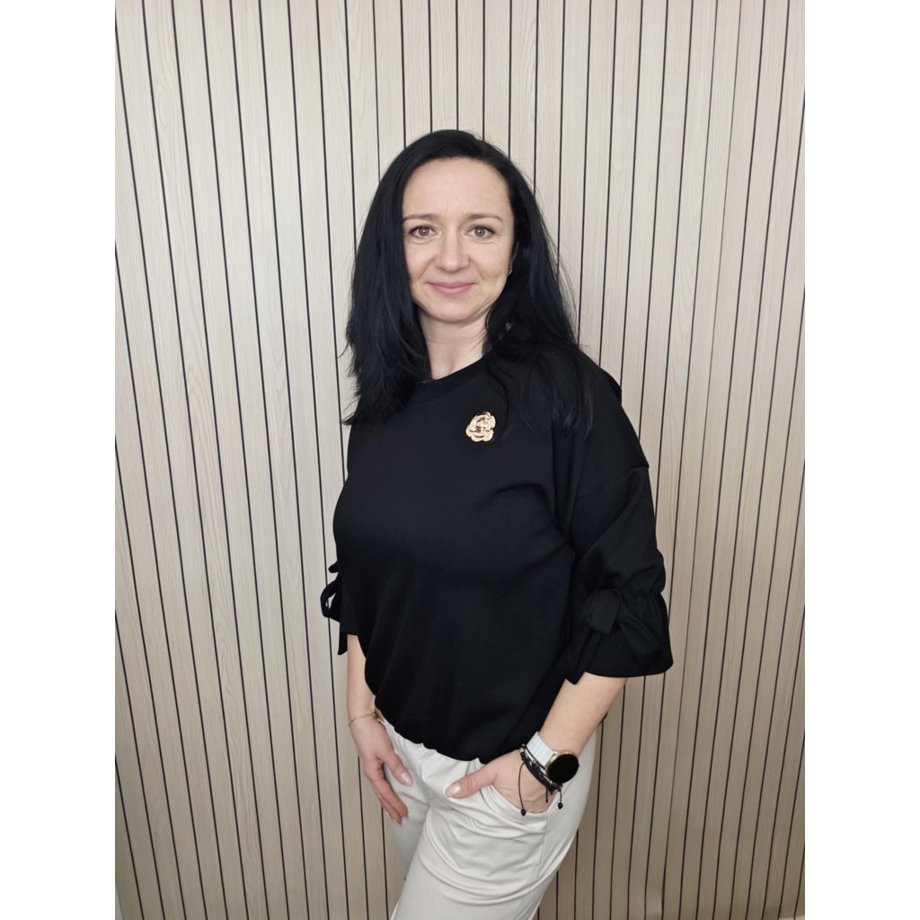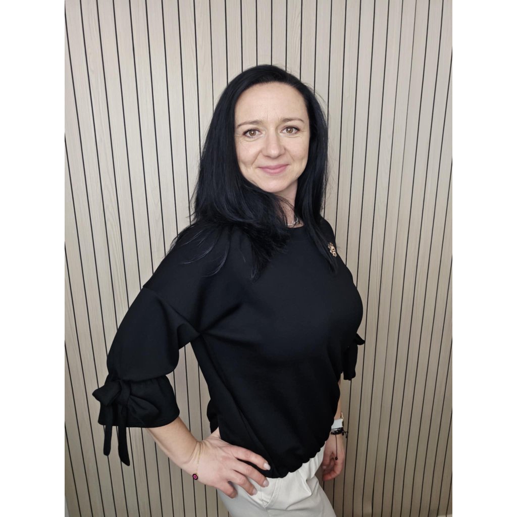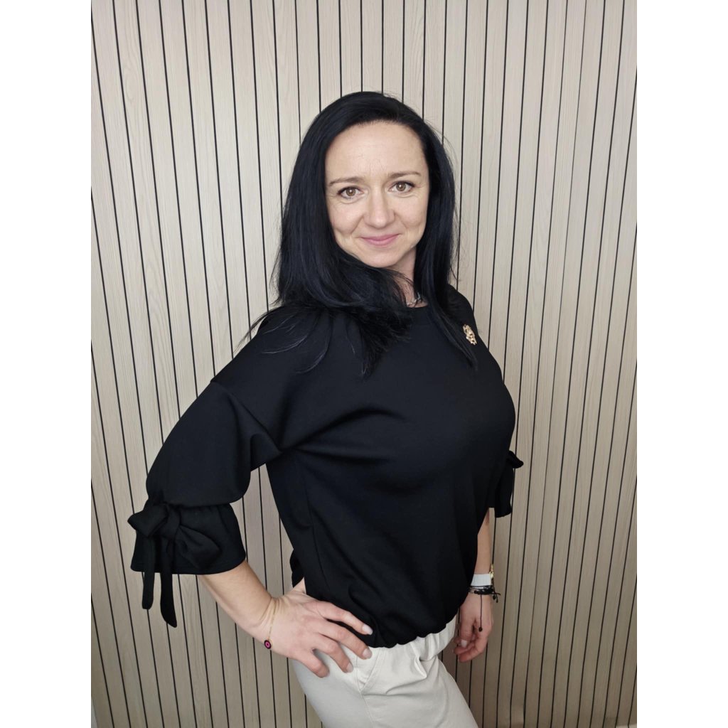 3/4 rukávy jsou zakončené efektní mašlí, která působí elegantně a zároveň schová běžné drobnosti (např. v oblasti paže). Střih je pohodlný a lichotivý, hodí se do práce, na schůzky i na běžné nošení – stačí přidat džíny, kalhoty s vyšším pasem nebo sukni.