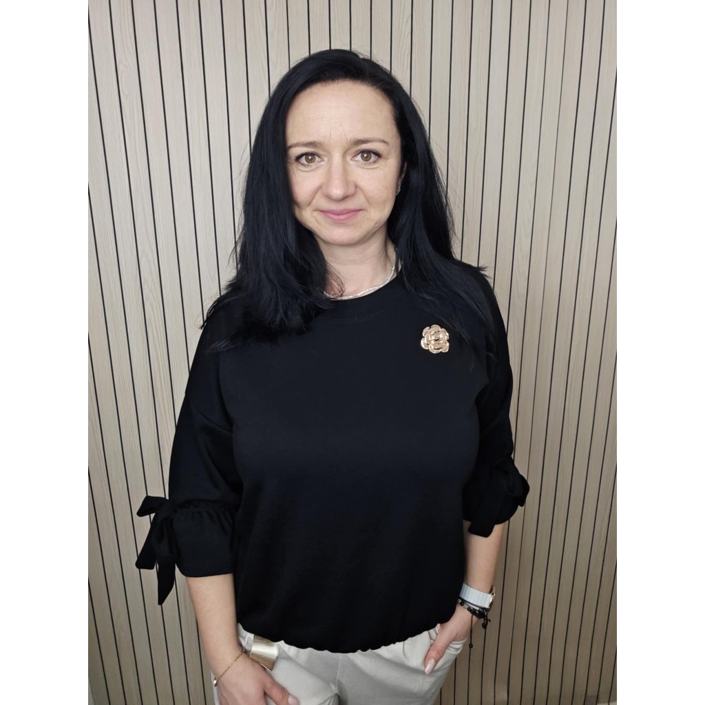 Halenka s květinovou broží černá s květinovou broží a mašlí na rukávu