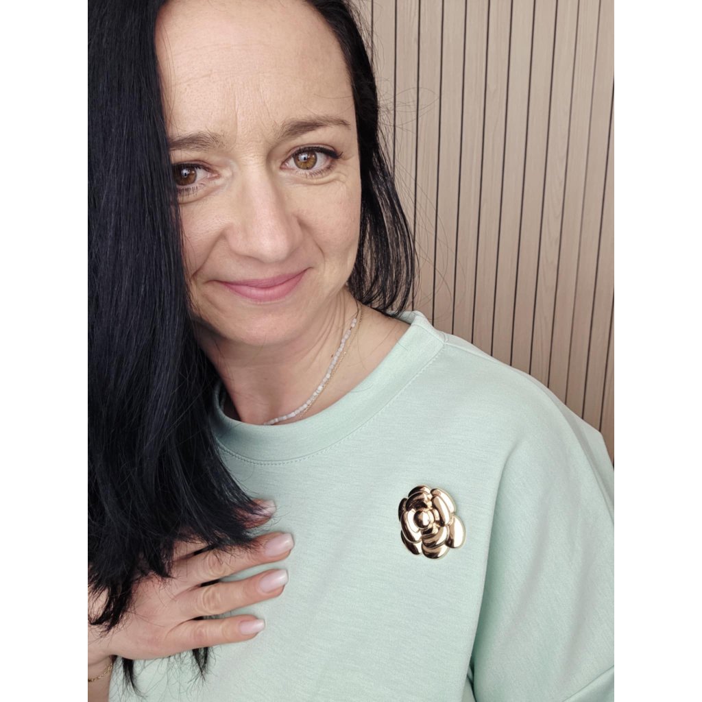 Tahle halenka je skvělý univerzál do šatníku – na první pohled zaujme květinovou broží, která dodá outfitu upravený, ženský vzhled i bez dalšího výrazného doplňku. Materiál z viskózy je měkký, příjemný na tělo a díky příměsi elastanu se hezky přizpůsobí postavě. Spodní lem je na gumu, takže halenka přirozeně sedí v oblasti pasu a dá se nosit volně přes kalhoty i lehce podkasaná pro více „blůzový“ efekt.