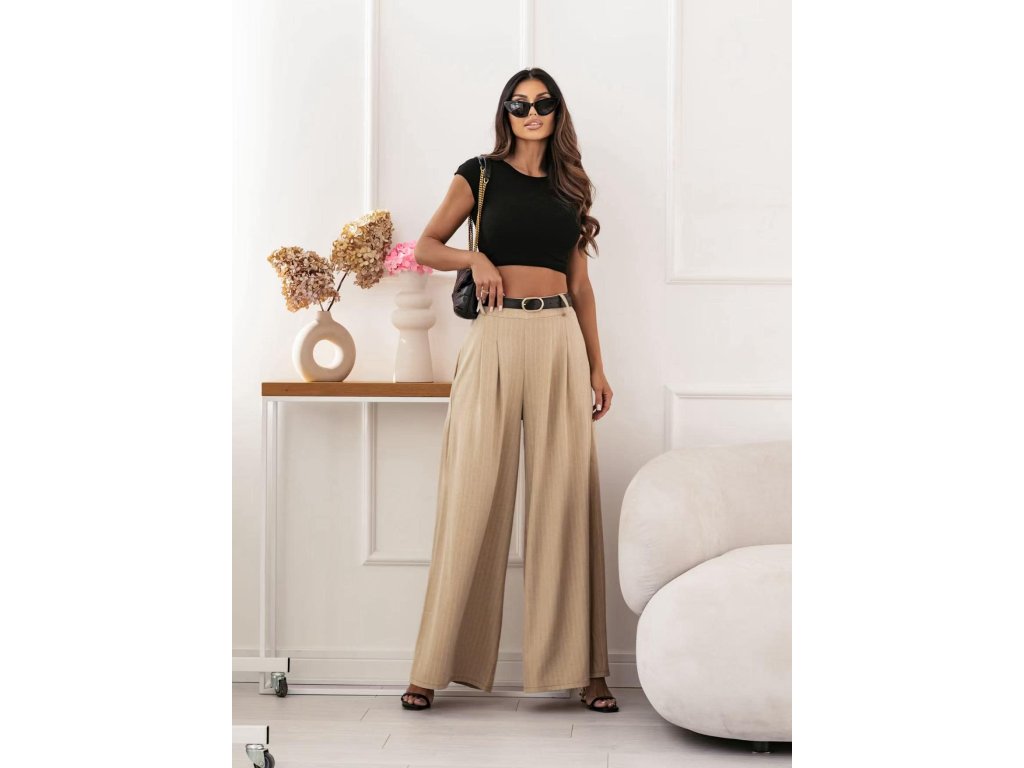 Představujeme vám kalhoty s širokými nohavicemi a jemným proužkováním. V pase jsou opatřeny pohodlnou gumou a doplněny černým koženkovým páskem se zlatou přezkou. Kalhoty jsou navrženy v univerzální velikosti, která se hodí pro postavy od velikosti S po L.