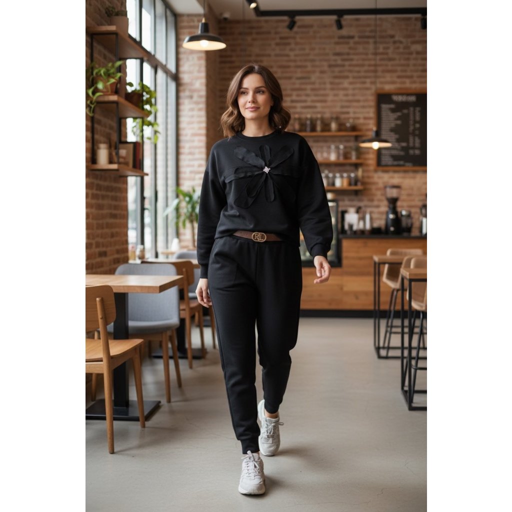 Tato dámská mikina s květinou je ideální volbou pro ženy, které chtějí vypadat upraveně i v pohodlném oblečení. Velký aplikovaný květ na předním díle s ozdobným kamínkem působí žensky a opticky přitahuje pozornost k horní části postavy, takže nenápadně odvádí pohled od bříška či boků – skvělé i pro ženy 50+.