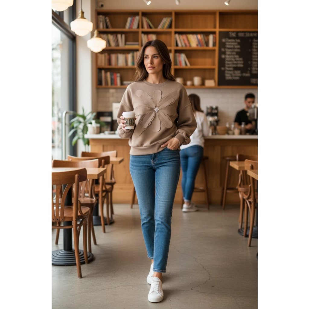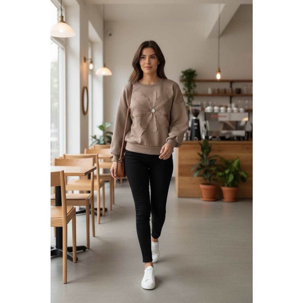 Tato dámská mikina s květinou je ideální volbou pro ženy, které chtějí vypadat upraveně i v pohodlném oblečení. Velký aplikovaný květ na předním díle s ozdobným kamínkem působí žensky a opticky přitahuje pozornost k horní části postavy, takže nenápadně odvádí pohled od bříška či boků – skvělé i pro ženy 50+.
