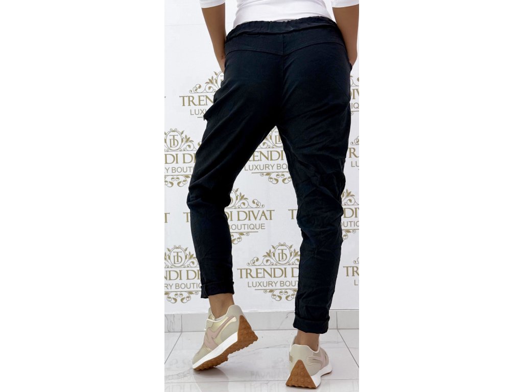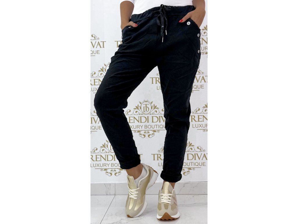 Tyto stylové a extrémně pružné kalhoty s krčeným efektem spojují pohodlí s moderním vzhledem. V pase mají praktickou gumu a tkaničku na stažení, díky čemuž se perfektně přizpůsobí různým typům postavy. Na bocích najdete dekorativní knoflíčky, které dodávají šmrnc, a boční kapsy, jež oceníte pro jejich praktičnost.