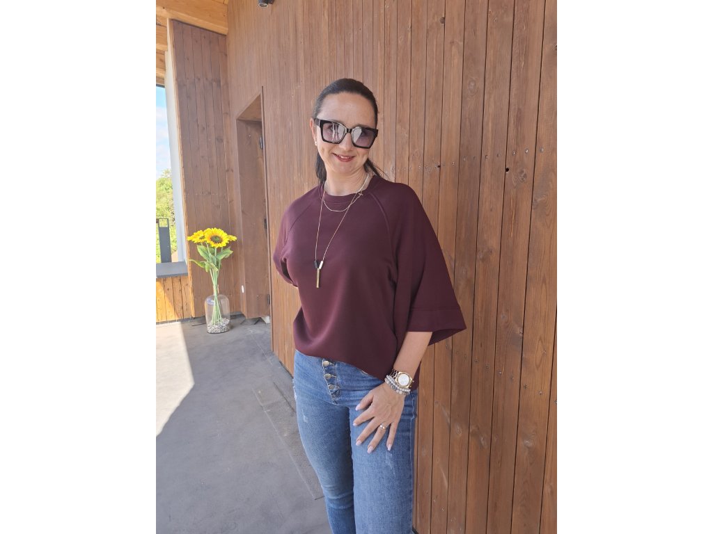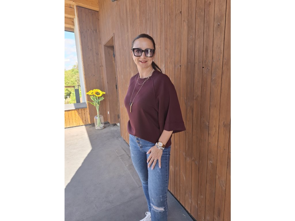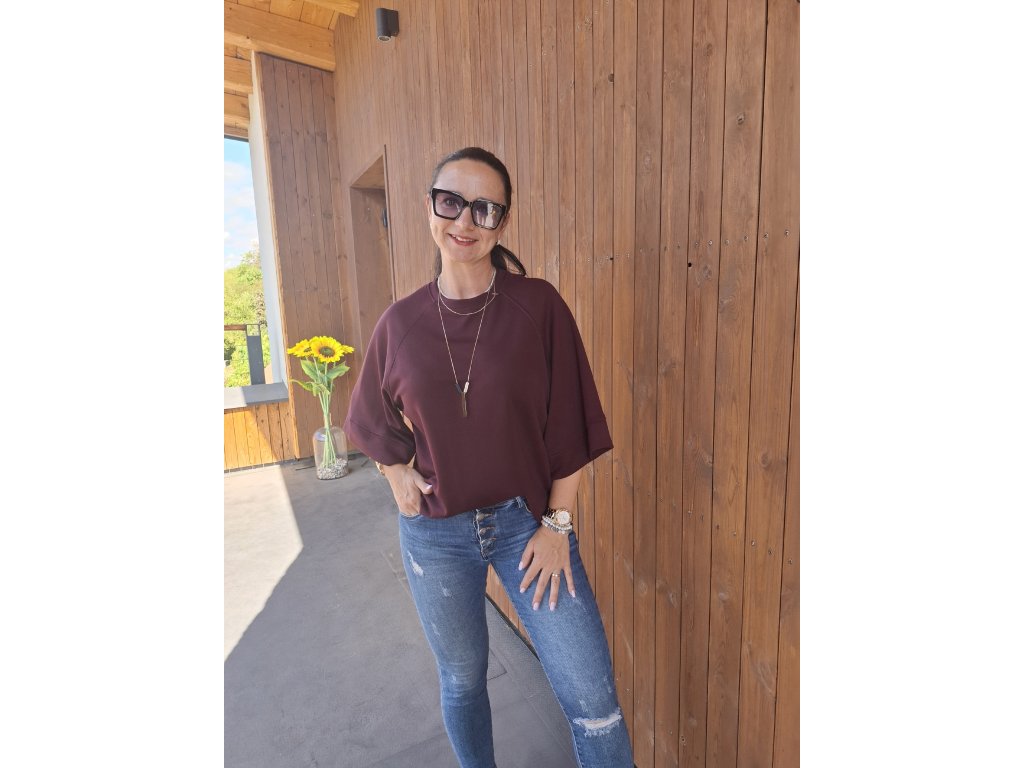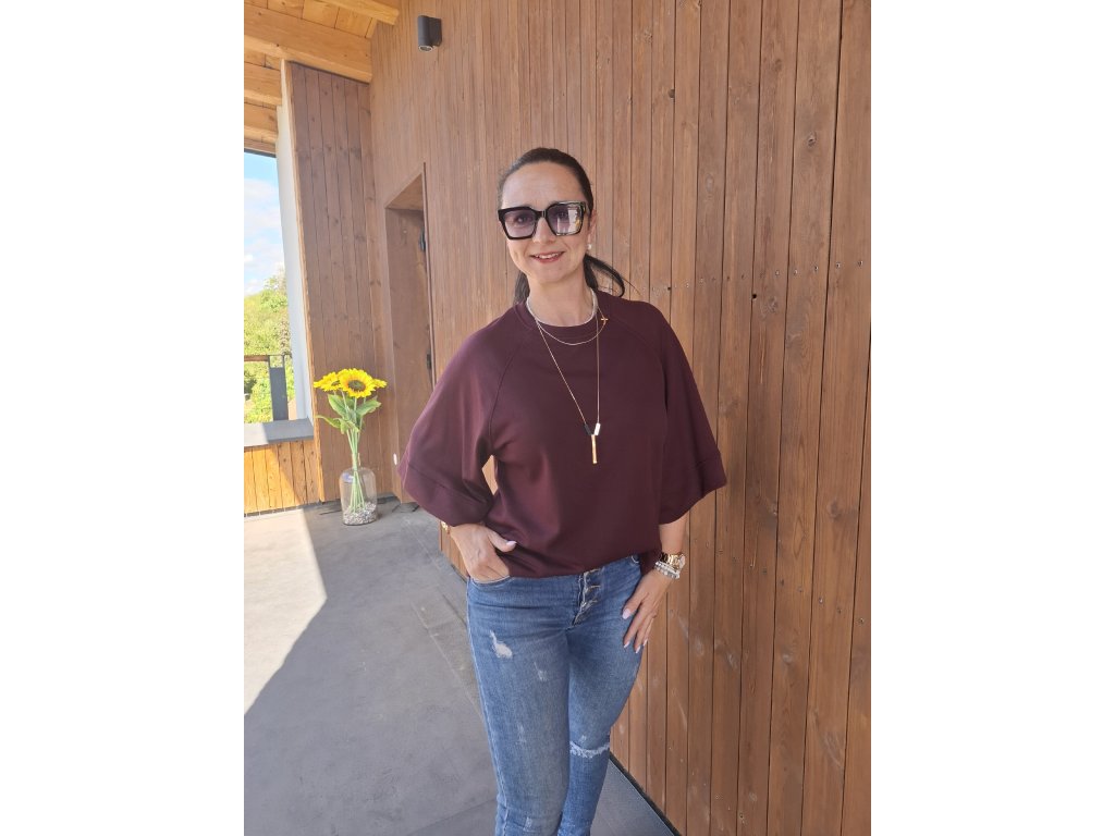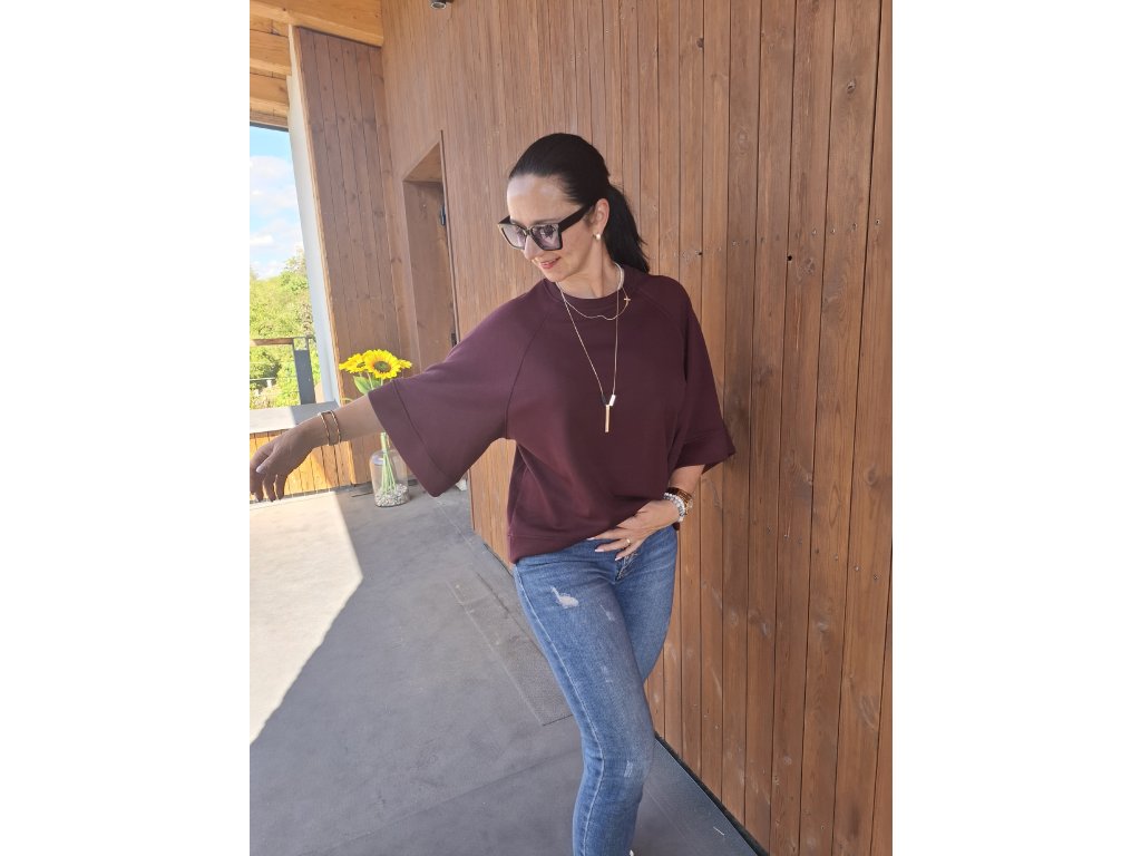 Elegantní oversize mikina v kratší verzi se širokým střihem a pohodlnými 3/4 rukávy je ideálním kouskem pro ženy, které mají rády styl i komfort. Díky univerzální velikosti padne na S–XL. Je vyrobena z měkkého, máslového materiálu, který je příjemný na dotek a dobře se nosí. Tento model je skvělou volbou nejen k džínám a legínám, ale i do kanceláře, na víkendové procházky, do městského stylu nebo na volnočasové setkání s přáteli. Rozměry: prsa 120 cm, délka 63 cm. Materiálové složení: 55% polyester, 29% viskóza, 6% elastan.