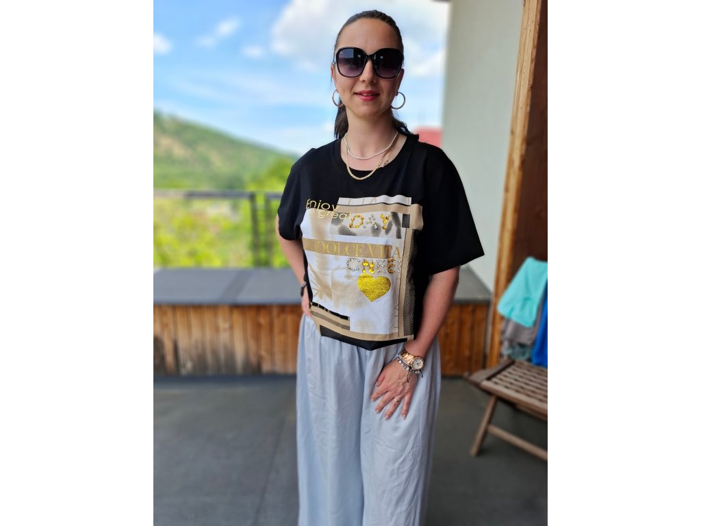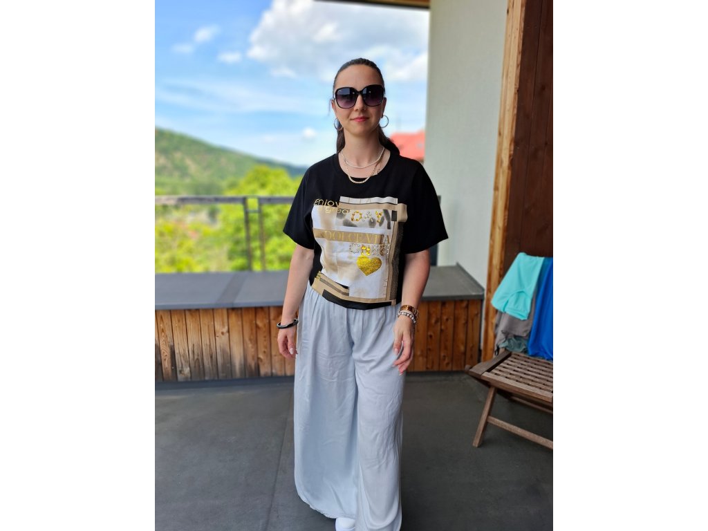 Elegantní a pohodlné černé tričko s výrazným zlatým nápisem na přední straně je skvělým doplňkem pro každodenní nošení. Díky univerzálnímu a oversize střihu perfektně padne na postavy od M po 3XL. Tričko má krátký rukáv, kulatý výstřih a rozměry: prsa 130 cm, boky 136 cm, délka 76 cm. Vyrobené z 95% bavlny a 5% elastanu, zajišťuje komfort a volnost pohybu. Modelka na fotce nosí běžně velikost M/L a tričko jí skvěle padne. Toto tričko je univerzálním kouskem, který skvěle doplní jakýkoliv ležérní outfit.