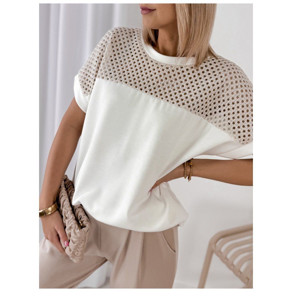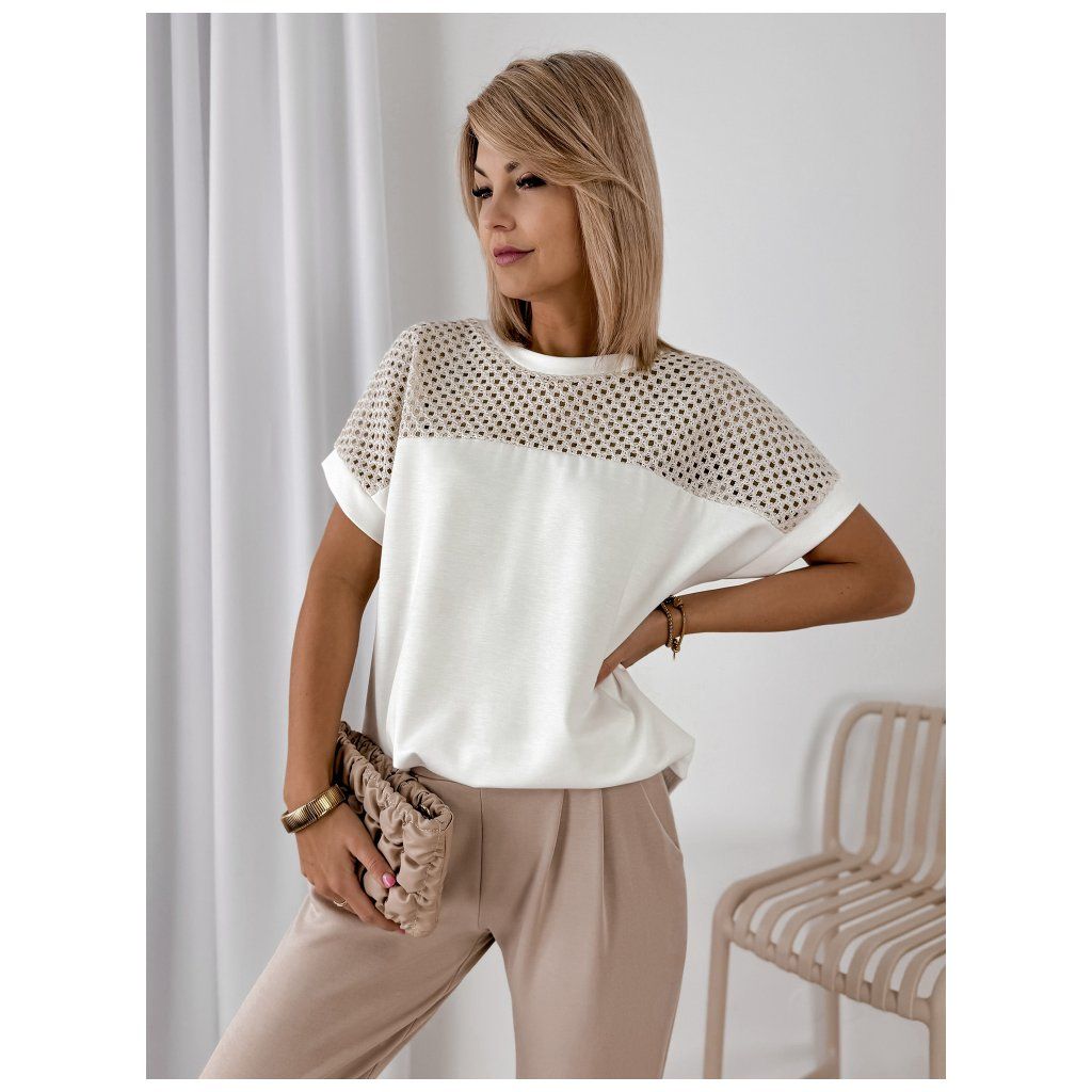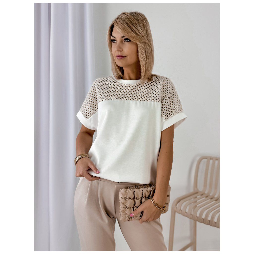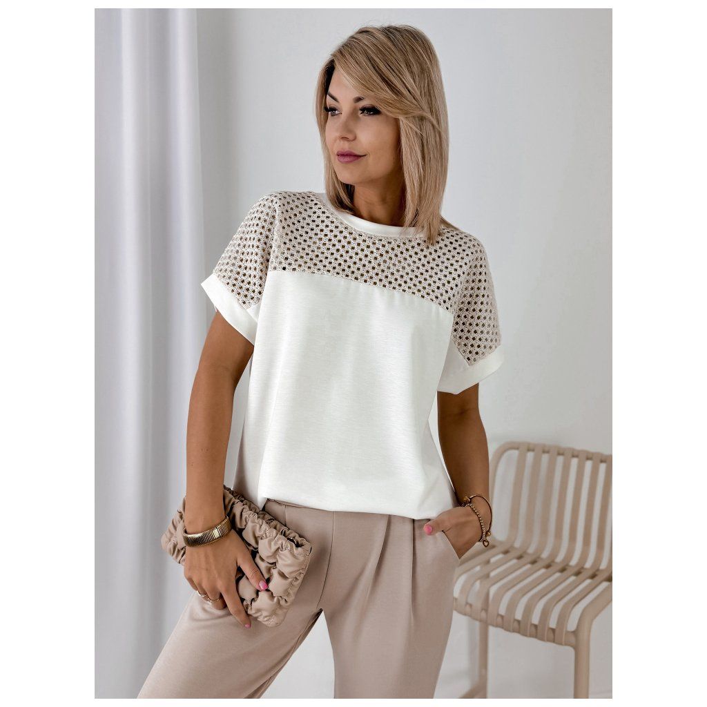 Elegantní triko s kulatým výstřihem zaujme na první pohled svou jemností a luxusním vzhledem. Vrchní část kolem ramen je z háčkovaného materiálu, který dodává modelu romantický nádech. Díky pastelovým barvám působí triko svěže a žensky – ideální volba pro jarní a letní dny.