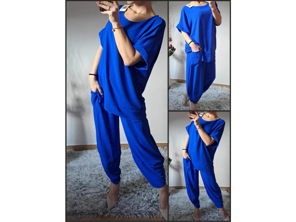 Objevte pohodlí a styl v jednom! Dvoudílný komplet ELLA se skládá z oversize trika s krátkým rukávem a kulatým výstřihem a volných kalhot zajímavého střihu, které mají kapsy na přední straně a pružný pas na gumu.