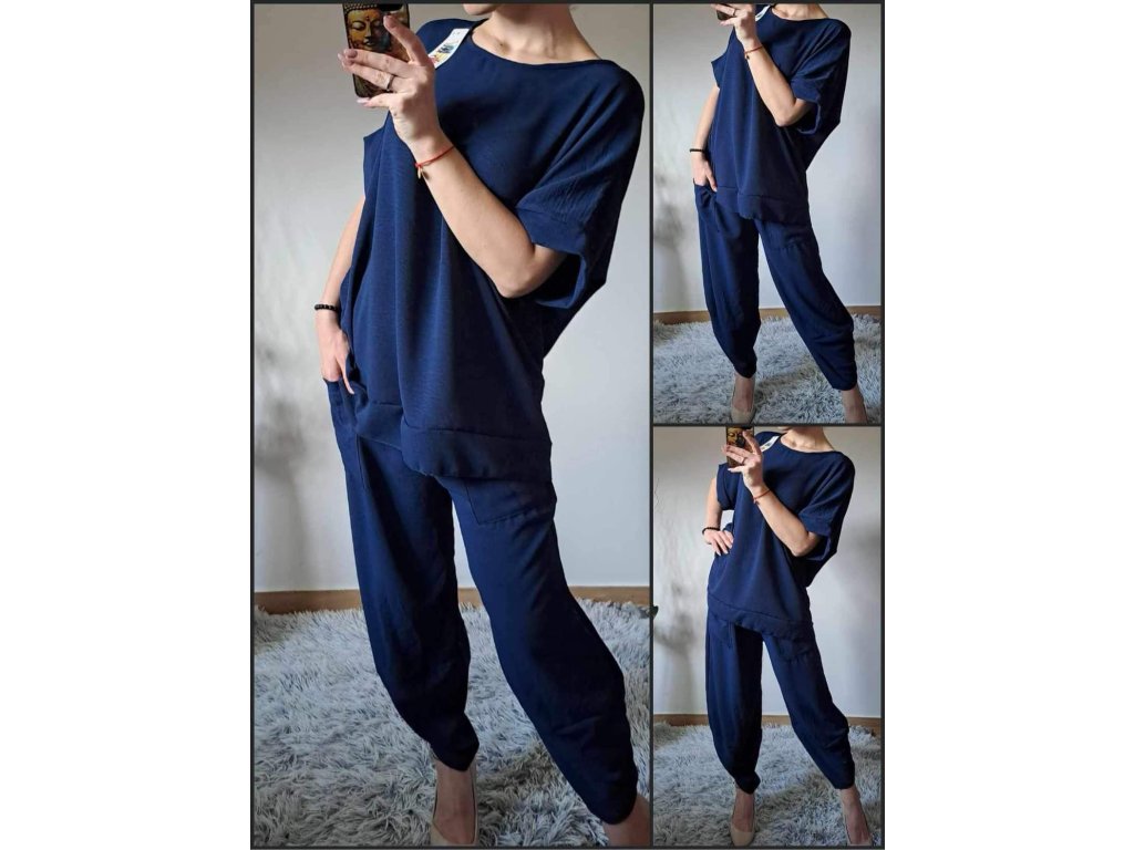 Objevte pohodlí a styl v jednom! Dvoudílný komplet ELLA se skládá z oversize trika s krátkým rukávem a kulatým výstřihem a volných kalhot zajímavého střihu, které mají kapsy na přední straně a pružný pas na gumu.