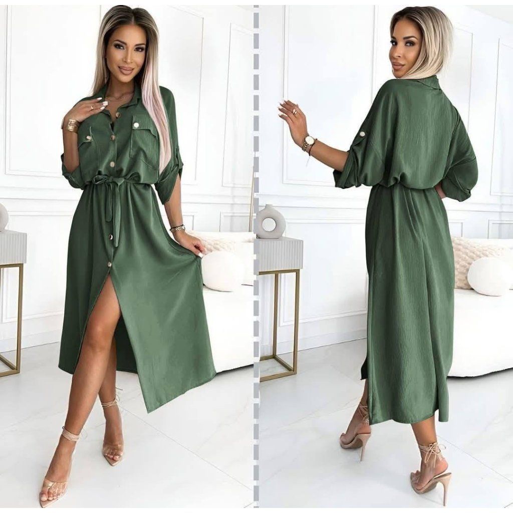 Košilové šaty RADO khaki Elegantní midi s 3/4 rukávem a zlatými knoflíky