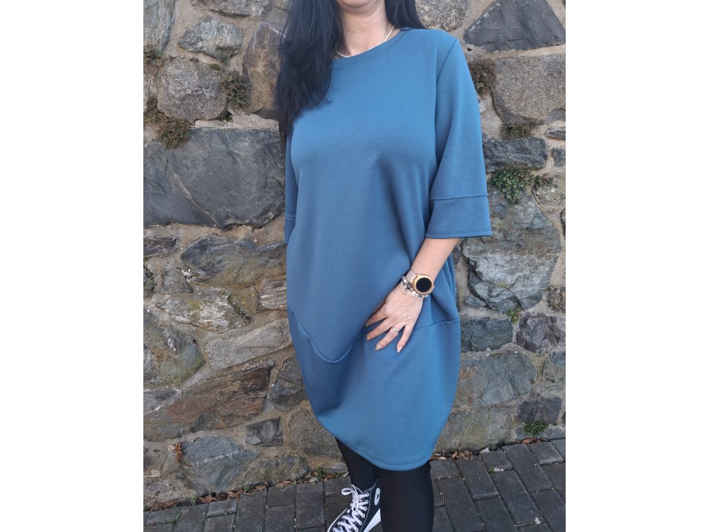 Tyto oversize šaty v nádherném petrolejovém odstínu jsou ušity z mimořádně hebkého máslového materiálu, který je absolutním hitem této jarní sezóny. Materiál je nejen krásně jemný na dotek, ale také velmi pohodlný na nošení. Šaty mají univerzální velikost, která díky volnému střihu perfektně padne každé postavě od S až po XXL. Modelka na fotografii běžně nosí velikost L.